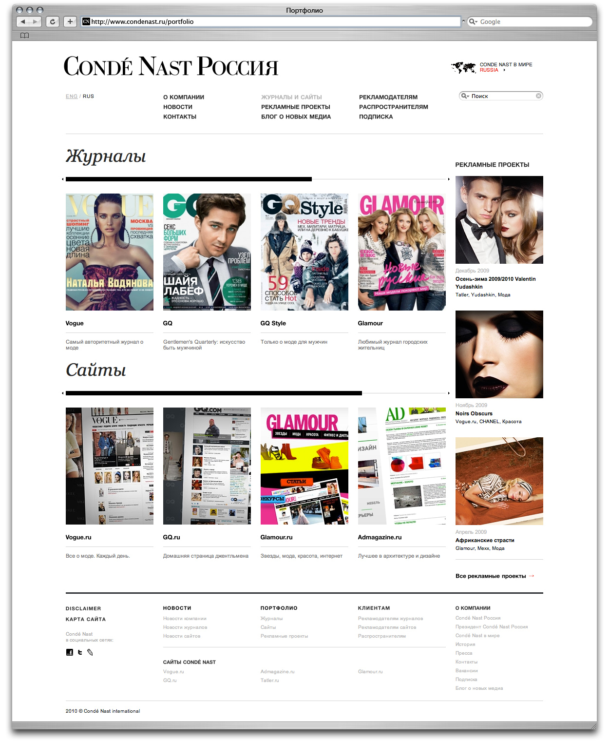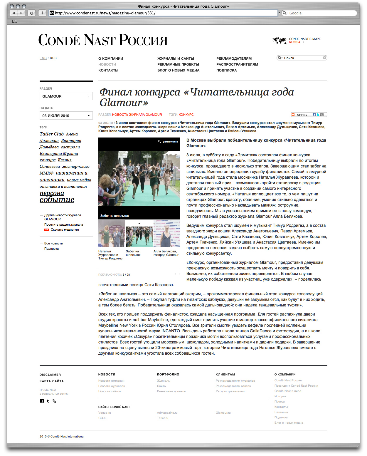 Рекламное агентство Aero разработало сайт для издательства Condè NastИздательский дом Condè Nast Россия объявляет о запуске корпоративного сайта Condènast.ru, разработанного в рекламном агентстве Aero.Корпоративный сайт в первую очередь ориентирован на клиентов и партнеров издательского дома, а также на журналистов, и тех, кто хочет получить оперативную и актуальную информацию о Condè Nast Россия и его проектах. "Корпоративный сайт должен быть удобным и функциональным, соответствовать визуальным стандартам издательского дома Condè Nast, который специализируется на премиальных высококачественных глянцевых медиа. Мы рады, что команде Condè Nast Digital совместно с веб-студией Aero удалось разработать лаконичный, изящный и удобный в навигации корпоративный ресурс. В качестве эксперимента на сайте заработает корпоративный блог о новых медиа, где мы будем делиться кейсами и примерами удачных интернет-проектов, а также писать о том, что нам самим интересно", - говорит Анита Гиговская, директор подразделения Condè Nast Digital. "Работать над этим проектом было весьма интересно, - рассказывает генеральный директор Aero и куратор проекта Николай Вершинин. - В соответствии с пожеланиями заказчика, сайт должен был обладать лаконичным, минималистичным дизайном, и при этом быть наполнен разнообразными технологичными "фишками", придумыванию и разработке которых мы уделили особое внимание. Интересными получились реализация галереи фотографий, просмотр рекламных проектов и многое другое". Сайт был запущен 8 сентября. |