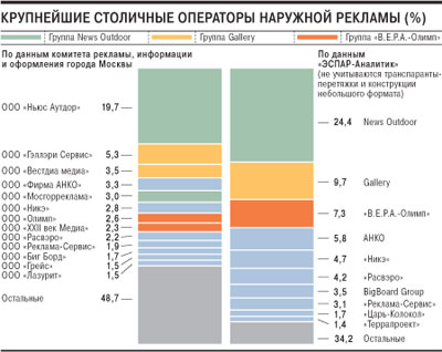 На 8 сентября владельцами рекламных конструкций в Москве числятся 4,83 тысячи юридических лиц, а общая площадь всех установленных рекламоносителей достигает почти 1,049 миллиона кв. м. 31% от общей площади - так называемая потребительская наружная реклама, которая устанавливается самим рекламодателем: крышные установки с логотипом компаний, въездные стелы возле торговых центров и т. п. А вот коммерческим размещением рекламы на остальных 69% площадей занимаются 122 юрлица, обладающих соответствующими разрешениями, сообщили "Коммерсанту" в комитете. Только у 16 компаний рыночная доля превышает 1%. Крупнейший московский оператор - ООО "Ньюс Аутдор" (группа News Outdoor) с долей 19,7%.