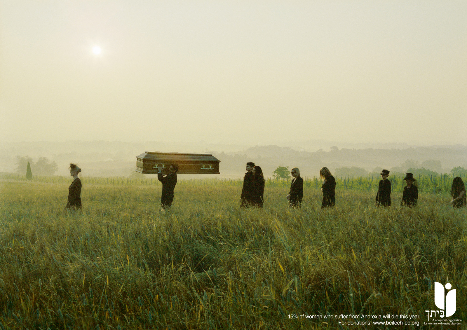 Beitech показали похороны анорексичкиРеклама организации, помогающей женщинам избавиться от этой болезниНекоммерческая организация Beitech занимается тем, что помогает женщинам справиться с различными расстройствами приема пищи, в частности с анорексией. Это одно из наиболее опасных заболеваний подобного рода, так как связано с отказом от пищи и экстремальной потерей веса, приводящей в конечном итоге к смерти. Израильское агентство Mccann Erickson Tel-aviv создало для организации Beitech довольно мрачный принт, на котором показаны похороны женщины, страдавшей анорексией - ее гроб из-за этого может нести всего один человек. Реклама сообщает, что 15% женщин, страдающих анорексией, умерли в этом году, и призывает обратиться за помощью в Beitech. Состав творческой группы Advertising Agency: Mccann Erickson, Tel-aviv, Israel VP Creative: Eldad Wienberger, Tal Raviv Creative Director: Igal Hazan Art Director: Ifat Shleziger Copywriter: Asaf Zelicovitch VP Accounts: Ifat Wieder-Arad Account Director: Chen Biran |