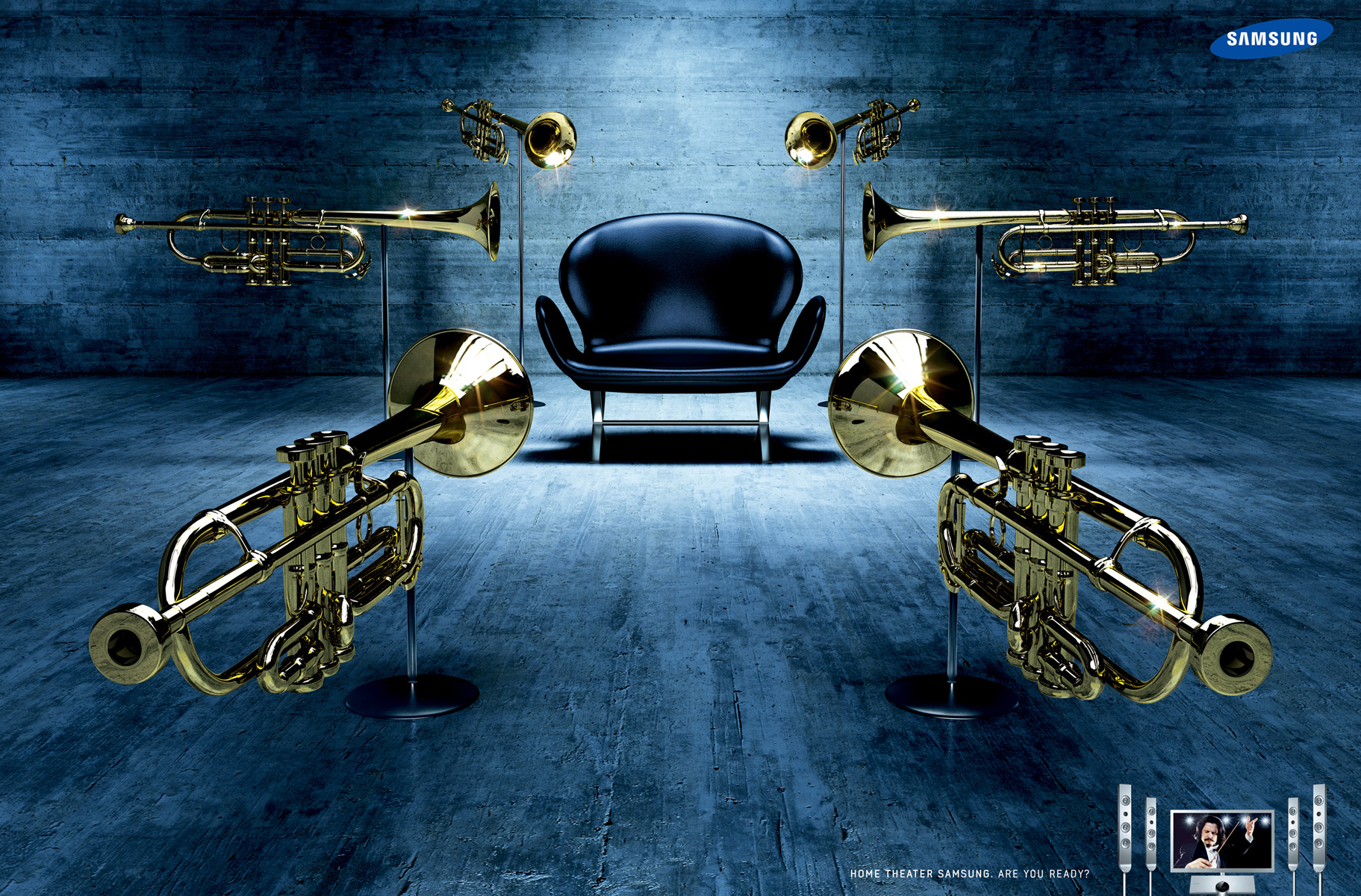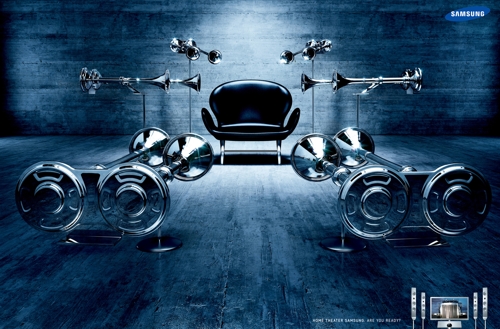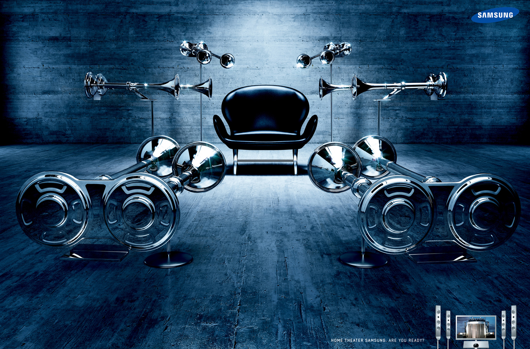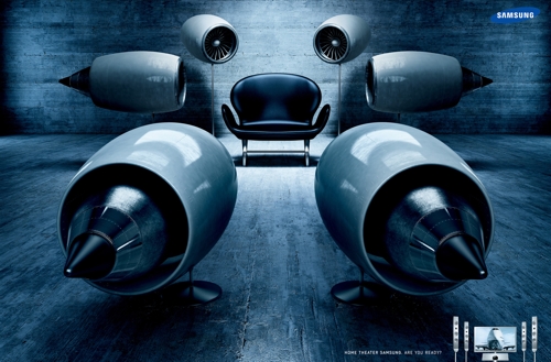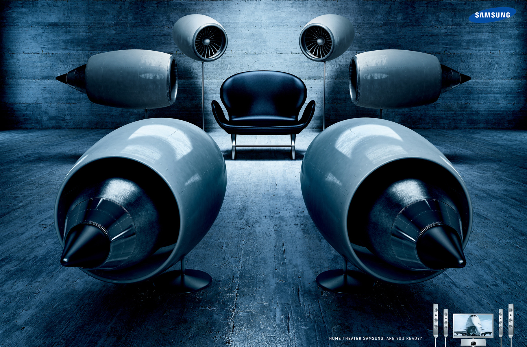 Samsung окружает турбинами самолетаРеклама подчеркивает мощную аудиосистему домашних кинотеатров SamsungАгентство Cheil из Сан-Паулу выпустило серию принтов для рекламы домашних кинотеатров Samsung. Реклама сосредоточена на демонстрации выдающихся звуковых возможностей техники - креаторы изобразили, что, благодаря аудиосистеме домашнего кинотеатра, зритель окажется словно бы в окружении турбин самолета, музыкальных инструментов и тому подобного. Слоган кампании пытается удостовериться, что люди готовы пойти на риск оказаться между шестью турбин: "Домашний кинотеатр Samsung. Вы готовы?" Состав творческой группы Advertising Agency: Cheil, Sao Paulo, Brazil Creative Director: Alessandro Cassulino Art Directors: Leo Corrla, Alessandro Cassulino Copywriter: Fabio Pinheiro Illustrator: Gelmi, Sao Paulo, Brazil Image Treatment: MasterMind, Sao Paulo, Brazil |