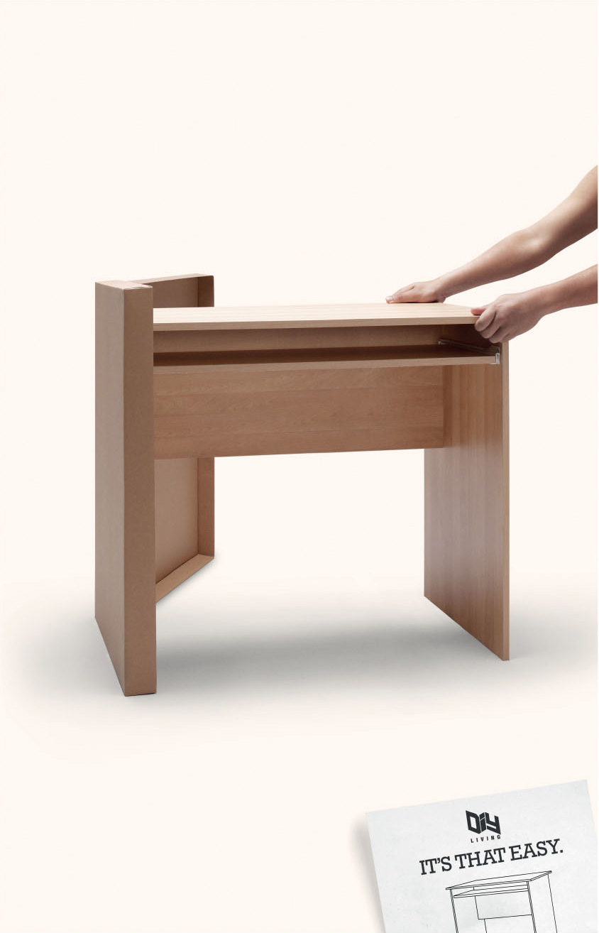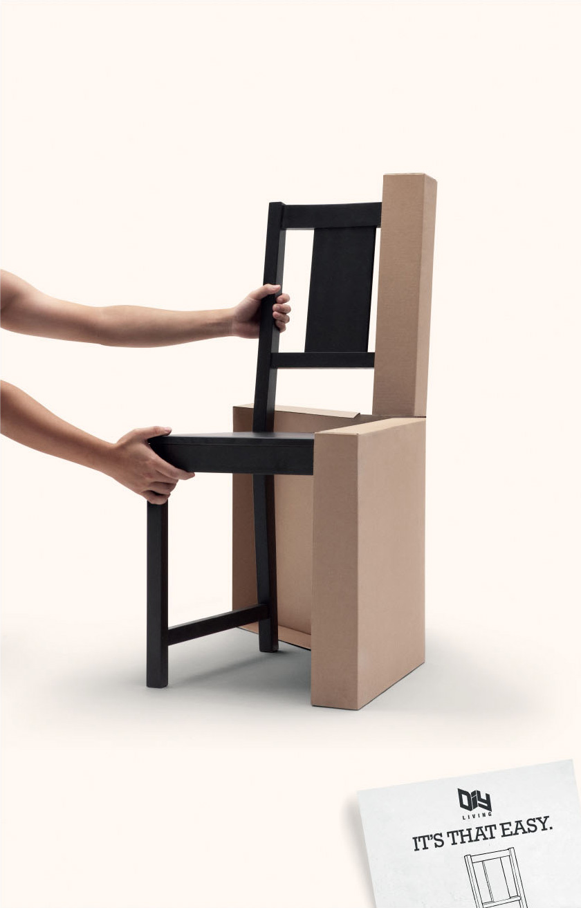DIY Living: мебель, которую слишком легко собратьСингапурская рекламная кампания мебельного брендаPublicis Singapore выпустило рекламу мебели DIY Living, которая убеждает, что столы и стулья этого бренда готовы собираться сами собой. Удивительным образом реклама заставляет вспомнить IKEA с ее сверхупрощенными и подробными инструкциями по сборке мебели, возможно авторы и ставили перед собой цель немного уколоть мировую компанию. Согласно рекламе, мебель DIY Living собирать так просто, что кажется, будто вынимаешь ее из коробки уже полностью собранной. Слоган кампании: "Это так просто". Состав творческой группы Advertising Agency: Publicis Singapore Executive Creative Director: Ajay Thrivikraman Creative Director: Alex Lim Thye Aun Art Directors: Tattoo Yar Wen Sen, Kee Wei Shern Copywriters: Kee Wei Shern, Tattoo Yar Wen Sen Photographer: Sebastian Siah / Shooting Gallery Asia Retoucher: Wishing Well Asia |