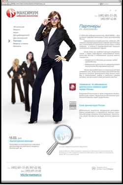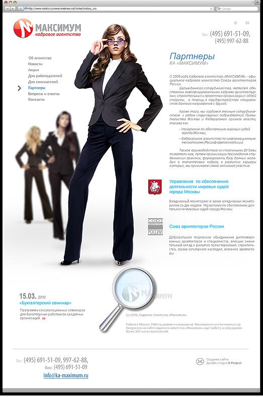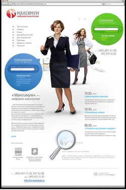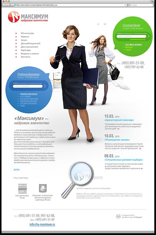 Кадровое агентство "Максимум" ищет кадры с новым сайтомВ середине сентября 2010 года дизайн-студия X-Project завершила разработку нового web-сайта для кадрового агентства "Максимум" www.ka-maximum.ru.Как рассказывают в студии, заказчику сразу предложили здесь концепцию, которая подразумевала бы сопровождение сайта яркими уникальными иллюстрациями, соответствующими различным разделам ресурса; в то же время максимально легкую, без второстепенных художественных элементов усложняющих восприятие. Посмотрев первичные скетчи, заказчик утвердил эту идею, родилась главная страница сайта, на которой дизайнеры X-Project изобразили представительниц целевой аудитории web-сайта: на первом плане стоит солидная деловая женщина, олицетворяющая собой работодателя, позади нее - амбициозная молодая девушка-соискатель, занимающаяся поиском работы. |