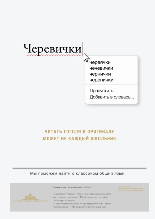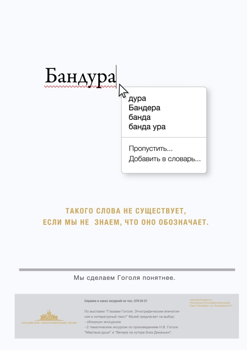 Мертвый шаман ушел вслед за бандурой"Небо" и Российский Этнографический музей показали исчезнувшего шаманаАгентство "Небо" продолжает сотрудничество с Российским Этнографическим Музеем. В начале лета этого года агентство сделало плакат-афишу для продвижения выставки "Путешествие в другие миры: шаманизм народов Сибири". Выставка "Путешествие в другие миры: шаманизм народов Сибири" отражает уникальный феномен традиционного мировоззрения коренных народов Крайнего Севера, Сибири и Дальнего Востока - шаманизм. Cогласно представлениям народов Сибири шаман считался избранником духов, посредником между человеком и сакральным миром. Он обладал способностью видеть иную реальность и путешествовать по мирам Вселенной. О многочисленных сверх-способностях шаманов ходят легенды в и в наше время (например о способностях внезапно исчезать, внезапно появляться или находиться одновременно в разных местах). Именно поэтому в агентстве рещили изобразить на плакате на традиционные шаманские атрибуты (бубен и тд), а исчезающие следы "Небо" уже разрабатывало рекламу для Этнографического музея. В 2009 году в Российском этнографическом музее открылась выставка, приуроченная к 200-летию со дня рождения Николая Гоголя. На выставке "Глазами Гоголя. Этнографические впечатления и литературный текст" были собраны многочисленные экспонаты, которые дают представление о российском и украинском быте первой половины XIX века. На выставке, к примеру, школьники могли не только узнать, что такое бричка, рушники или черевички, но и в буквальном смысле потрогать это руками. Основная идея, которая легла в основу всех материалов, свелась к тому, что современные школьники, читая Гоголя, зачастую просто не понимают значения некоторых слов. А данная выставка этнографического музея помогает читать Гоголя "в оригинале". Плакаты форматов А5 и А3 размещались в декабре 2009 года в школах Адмиралтейского, Василеостровского и Центрального районов, а также в Академии постдипломного образования для учителей. Очень скромная по своему масштабу кампания, тем не менее, была оценена сотрудниками музея как результативная. Количество заказанных экскурсий после старта кампании возросло на 68%.
