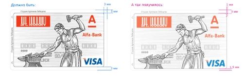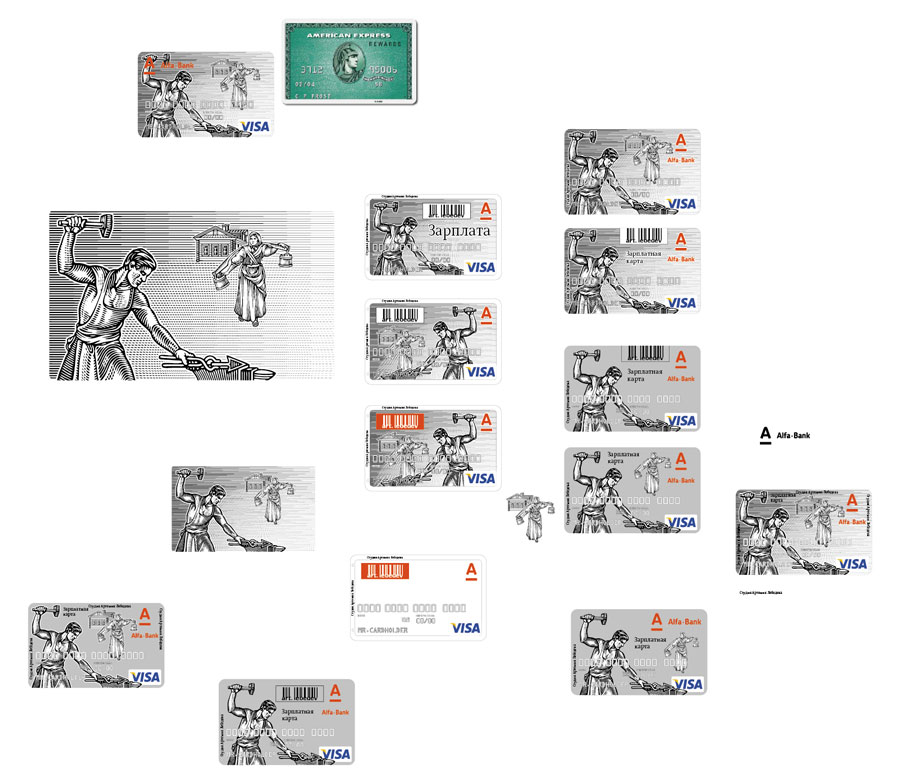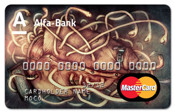 Состав творческой группы арт-директор - Артемий Лебедев метранпаж -Сергей Федоров иллюстратор - Марина Новикова главный бухгалтер - Лена Шлык Студия Лебедева выражает благодарность Норику Григоряну и Альфа-Банку за помощь в работе над проектом Карта делается по гайдлайнам Альфа-Банковских карт, что накладывает ограничения: фиксированные положения и цвета логотипа банка и платежной системы. Весь дизайн, по сути - фоновое изображение.