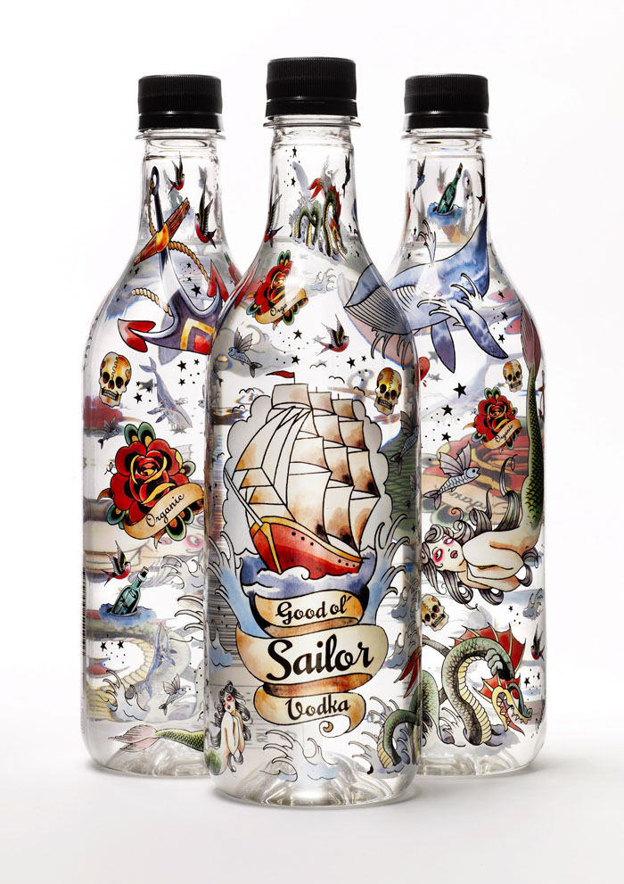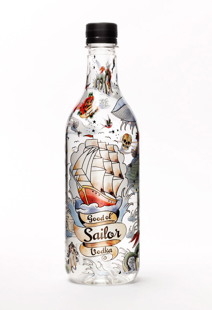 Водка в пластиковой бутылкеДизайн водки Good Ol' SailorВ Швеции выпустили первую водку в пластиковых бутылках. Она получила название Good Ol' Sailor Vodka и позиционируется как еще один экологически чистый напиток, сделанный целиком из органического сырья. Специально для этой водки компанией Petainer были изготовлены особые пластиковые бутылки, которые, как заявлено, полностью экологически чисты и прозрачны. Необычность тары подчеркивается красивым и сложным рисункам по всей поверхности бутылки. Производители водки Good Ol' Sailor сделали все, чтобы их продукт был замечен на полке. Хотя как отнесется потребитель к самому напитку в платсике прогнозировать сложно, так как для многих стеклянная бутылка является показателем качества, тем более когда речь идет о крепких напитках. |