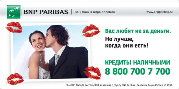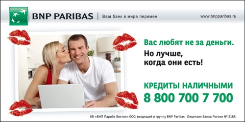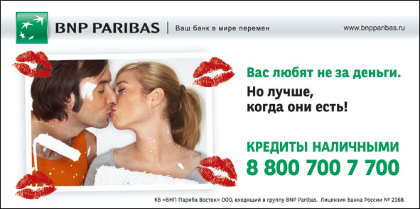 Банк BNP Paribas любит клиентов не за деньгиБанк BNP Paribas увеличивает максимальный срок предоставления кредитов с 3 до 5 лет вслед за значительным снижением ставок по потребительским кредитам на неотложные нужды (кредитам наличными) в августе 2010 года.В поддержку нового предложения банк начал рекламную кампанию, которая включает в себя наружную и Интернет рекламу и продлится до конца октября. Основная цель рекламной кампании - укрепление позиций бренда BNP. В ходе рекламной кампании предстоит сделать предложение, понятное и близкое максимальному количеству потенциальных клиентов. Основной слоган кампании: "Вас любят не за деньги. Но лучше, когда они есть". |