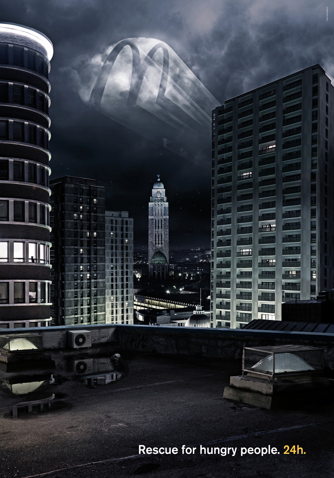 McDonald's заменил БэтменаФинские креаторы обыграли знаменитый знак в небе для рекламы закусочнойРекламисты из DDB Helsinki решили, что лого McDonald's в ночном небе ничем не хуже, чем знак Бэтмена. Они провели интересную аналогию: "Человек-летучая мышь" стоит на страже закона и не дает преступникам спуску ночью, а McDonald's, в свою очередь, борется с голодом круглые сутки. Слоган кампании "Спасение для голодных. 24 часа в сути". Состав творческой группы Advertising Agency: DDB Helsinki, Finland Creative Directors: Jukka Mannio, Vesa Tujunen Art Director: Jukka Mannio Copywriter: Vesa Tujunen Photographer: Joonas Antikainen / Left & Right Retoucher: Antti Salminen Account Director: Jarno Lindblom Account Manager: Pia Eiro Additional credits: Kirsi P?rni, Kimmo Syvari |