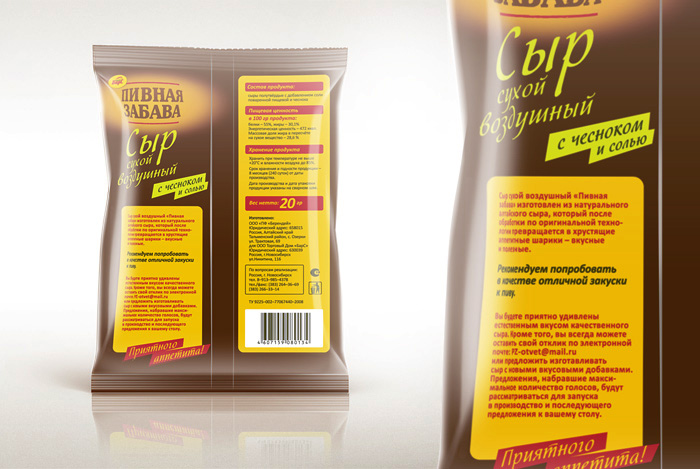 "Пивные забавы" для новосибирцевНовосибирское многопрофильное агентство "Рекламист" разработало для компании "БарС" упаковку линейки "Пивная забава". Под этой маркой выпускается сухой сыр.Продукт представляет собой твердый сыр, из которого удалена влага. Он рассчитан на широкий круг потребителей. Основные требования к упаковке, отраженные в брифе: наличие прозрачного элемента на лицевой стороне, наглядное отражение вкуса (без добавок, с чесноком или с перцем), а также размещение логотипа "Пивная забава" в верхней части. Сухой сыр в новой упаковке появится в продаже уже в этом году. |