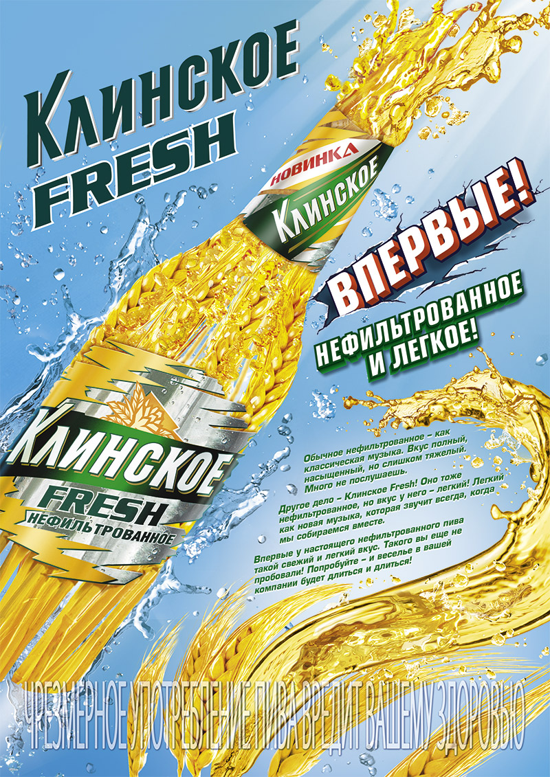 Grey Moscow "освежили" кампанию нового "Клинского"В телеэфире вовсю идет рекламная кампания САН ИнБев "Открывай! Освежайся!" по запуску нового нефильтрованного пива Клинское Fresh.Рекламная кампания, разработанная агентством Grey Moscow. В агентстве рассказывают, что здесь постарались уйти от стандартного рекламного микса - традиционных роликов, классических принтов и радиоспотов. Вместо этого были разработаны нестандартные вариации - спонсорские заставки, интегрирование в спецпроекты, нестандартная наружная реклама, Интернет-игры. Рекламный слоган кампании: "Открывай! Освежайся!". Креативная идея - невероятная комбинация легкости и насыщенности пива Клинское Fresh. Рекламное сообщение адресовано молодым людям от 18 до 24 лет - оптимистам, с прекрасным чувством юмора, но также рассчитано и на более старшую аудиторию - 25-29. Эльдар Джинчарадзе, креативный директор Grey Moscow: "Мы постарались отойти от классических рекламных приемов, которые, на наш взгляд, меньше воздействуют на эту целевую группу, и использовать нестандартные решения. Они не раздражают и способны вызывать больше положительных эмоций по отношению к бренду". Рекламная кампания проходит в Москве, Сибири, Западном регионе и на Урале. Медиа планирование кампании осуществляло агентство Universal McCann. В столице задействован ряд каналов коммуникации: TV - спонсорство телевизионных программ (Comedy Battle с Павлом Волей (ТНТ), рубрика "Кино" (СТС); Пресса: реклама в журналах Time Out, Discovery, Афиша, Большой город, Отдохни!, Антенна; Наружная реклама: форматы (6х3), сити-формат, нестандартные наружные конструкции 6х3, нестандартные перетяжки, суперсайт; Транспорт: стикеры в метро; вставки в промо-боксы; POS-материалы: нестандартный шелфбаннер; Реклама в Интернете: баннеры, промо-страницы с промо-игрой. Состав творческой группы: САН ИнБев: Бренд менеджер группы: Вера Мошкина Бренд менеджер: Анастасия Дубровская Grey Moscow: Креативный директор: Эльдар Джинчарадзе Арт-директора: Иван Заруцкий, Александр Пожогин Старший копирайтер: Александр Ибрагимов Продюсер: Александр Войтецкий Директор по стратегическому планированию: Малик Умбетбаев Директор по работе с клиентами: Татьяна Дубинец Старший менеджер по работе с клиентами: Анна Четкина Специалист по работе с клиентами: Мария Урнова Продакшн: Режиссер/оператор: Михаил Агранович Диктор: Павел Пудан Продакшн: Трехмер Продюсер: Евгений Телегин Арт-директор: Артем Галеев Постпродакшн менеджер: Ирина Шорикова