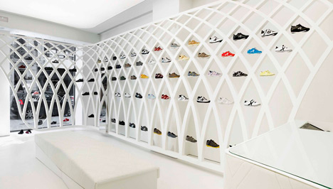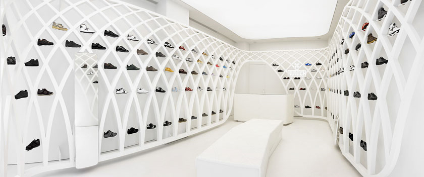 Дизайнеры создали "храм спортивной обуви" MunichИспанский магазин спортивной обуви Munich обзавелся оригинальными стеллажамиВ большинстве обувных магазинов демонстрация новых коллекций проходит одинаково: лучшие пары водружают на маленькие пьедесталы с подсветкой и выставляют на витрине, а остальным достаются скучные полочки на стенах бутика. Совершенно иной подход избрали дизайнеры из Барселоны - стеллажи обувного магазина Munich представляют собой целую арену или, если угодно, святилище спортивной обуви. Проект дизайнерской студии Dear Design получил название "Фрактальная арена". Он представляет собой лакированную железную конструкцию, выкрашенную в белый цвет. Конструкция охватывает все внутреннее пространство магазина. Светлое открытое пространство идеально подходит для демонстрации обуви - такой эффект достигается лампами рассеянного света, сочетанием белых стеллажей с белым полом и стенами, а также лакированной мебелью в тон. Каждая модель спортивной обуви помещена в отдельную нишу, в которой она как будто парит в воздухе (фиксатор практически незаметен), таким образом, посетителю предоставляется максимальный обзор продукта. При создании конструкции дизайнеры нашли вдохновение в крестообразном логотипе компании Munich, так что стеллажи напоминают не то готические остроконечные арки, не то "вафельную" подошву кроссовок, и даже баскетбольную сетку. Фрактальный дизайн полок, стежки на обивке скамьи и даже фиксаторы для обуви - все повторяет фирменный логотип. Главная идея этого простого и экономичного проекта - погрузить посетителей в организованную атмосферу спортивной арены (стадиона): клиент попадает из хаоса улиц в упорядоченное пространство магазина. |