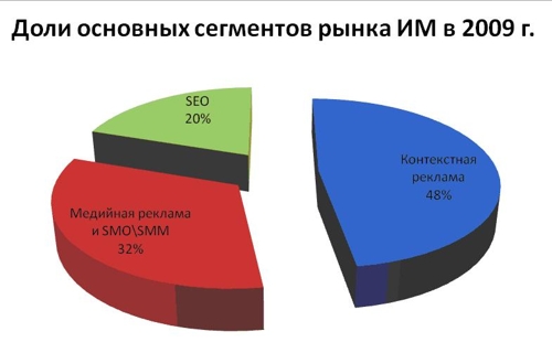 Рост популярности Интернета - увеличение продаж для бизнесаОбзор рынка интернет-маркетинга и рынка электронной коммерции за 2009 год и первое полугодие 2010 годаПривлечь новых клиентов, раскрутить свой бизнес, повысить продажи - и все это, не выходя из офиса! Еще несколько лет назад это казалось фантастикой. А сегодня стало реальностью. Сложно представить жизнь современного делового человека без Интернета. Бизнесмены все чаще решают деловые вопросы в виртуальном мире, который стал вполне реальной средой обитания для различных товаров и услуг. Рекламный рынок РФ в 2009 году: рос только сегмент интернет-маркетинга Популярность Интернета растет с каждым днем, с его помощью строятся многие бизнес-процессы: брендинг, популяризация и продвижение товаров и услуг, стимулирование и увеличение продаж. Эффективность и востребованность интернет-маркетинга (ИМ) в деле раскрутки бизнеса подтверждается тем, что он оказался единственным сегментом рынка рекламы, продемонстрировавшим рост (+8%) во время кризиса. Рекламодатели не захотели расставаться с таким видом продвижения, даже урезая рекламные бюджеты. Это неудивительно. На фоне снижения эффективности традиционных видов рекламы (печатная пресса, радио, наружная реклама и т.д.), интернет-маркетинг является примером рациональных и результативных инвестиций в развитие бизнеса. Непрекращающееся расширение виртуального пространства и аудитории Рунета, постоянный рост онлайн-торговли, различные виды интернет-рекламы и способы ее таргетирования - все это способствует укреплению популярности интернет-маркетинга, прочно занявшего свое место в комплексной стратегии развития современных организаций. Интернет-технологии позволяют быстро и с минимальными затратами привлечь на коммерческие сайты большое число "горячих" целевых посетителей, что приводит к значительному увеличению продаж и росту популярности товаров и услуг. И это уже реальный, а не виртуальный, процесс, который помогает компаниям и брендам существовать в условиях быстрых изменений рынка, жесткой конкуренции и масштабного падения спроса. Разновидности интернет-маркетинга Технологий интернет-маркетинга много и каждая из них открывает массу возможностей для рекламодателя. Три основных "кита": медийная (или баннерная) реклама; контекстная реклама; поисковая оптимизация и продвижение сайтов (другие названия этой же методики: web-оптимизация, раскрутка сайтов, Search Engine Optimization - SEO). Не забудем упомянуть рекламу и PR в социальных сетях (Social Media Optimization & Marketing, SMO \ SMM), блоггинг, нестандартную интернет-рекламу и PR (например, вирусный маркетинг). При выборе того или иного рекламного инструмента следует исходить из целевой аудитории, а также первоочередных и перспективных задач (имиджевых, сбытовых, информационных) конкретного бизнеса. Рынок интернет-маркетинга в 2009 году Одна из тенденций всего рынка рекламы РФ в 2009 г. - изменения в распределении рекламных бюджетов между различными медиаканалами: увеличение расходов на интернет-рекламу и поисковое продвижение сайтов при сокращении бюджетов на ТВ, радио, наружную рекламу, печатные СМИ, BTL-проекты. Причины: возросшая эффективность сетевых площадок, а также впечатляющие темпы роста рынка интернет-маркетинга все последние годы до кризиса: 2005 г. - 71%, 2006 г. - 67%, 2007 г. - 92%, 2008 г. - 39% (по данным Ассоциа
