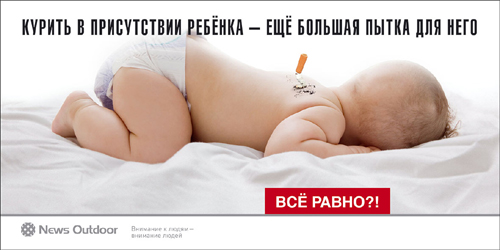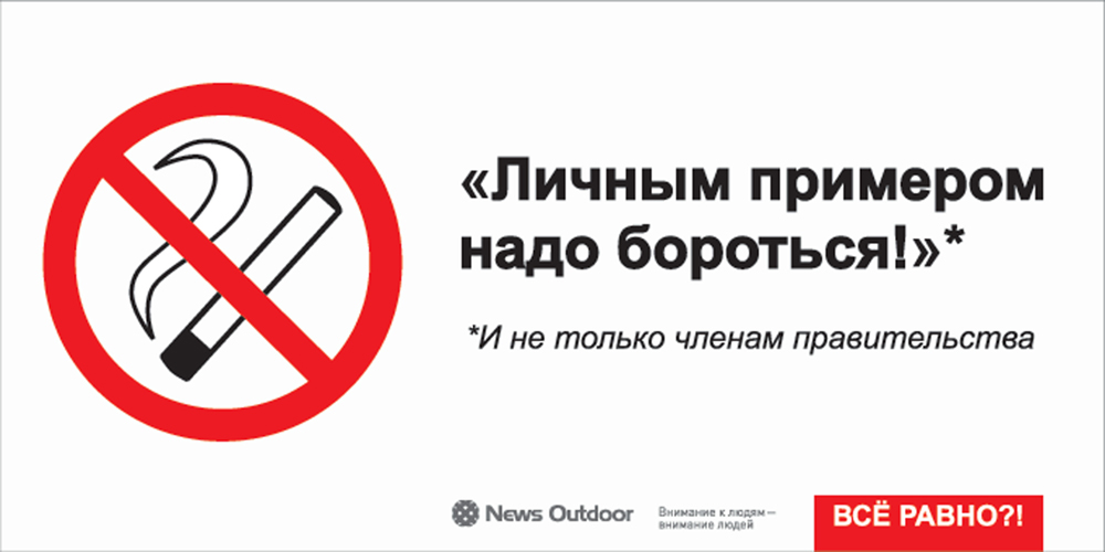Кампания "Всё равно?!" продолжилась личным примером ПутинаВ октябре стартует новый этап социального проекта "Все равно?!", направленного на борьбу с курением. Кампания инициирована News Outdoor, в ее основе - обращение премьер-министра РФ Владимира Путина к курящим членам правительства с предложением личным примером бороться с вредной привычкой. Слова главы кабинета министров были адресованы министрам на заседании президиума правительства России 5 октября 2010 г.На этом заседании, посвященном концепции борьбы с табакокурением, глава Минздравсоцразвития РФ Татьяна Голикова рассказала о том, что, по данным Всемирной организации здравоохранения, Россия занимает первое место в мире по потреблению табака. Среднестатистический россиянин выкуривает 17 сигарет в день. Ежегодно от заболеваний, связанных с курением, умирает 400 тысяч человек. В долгосрочной перспективе правительство планирует снизить число курящих в нашей стране на 10-15%. Владимир Путин призвал членов правительства активнее бороться с табакокурением, а тем, кто курит - показать личный пример. Организаторы очередной антитабачной кампании в рамках проекта "Все равно?!" надеются, что не только курящие члены правительства, но и представители других профессий и социальных слоев нашего страны сделают правильный выбор и откажутся от вреднейшей привычки. Кампания проходит в Москве. Постеры размещаются на поверхностях 6х3, сити-формата и уличных скамейках. Как видно по иллюстрации, креаторы стали более сдержанны в своих творческих порывах. Вероятно, причиной этому стала крайне неоднозначная реакция на социальную рекламу, ранее размещенную в рамках проекта "Все равно?!". Самую скандальную известность обрел макет с младенцем, прижженным сигаретой. |