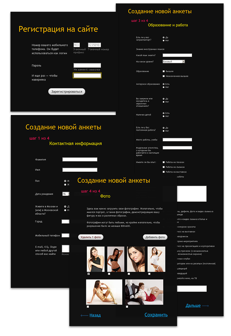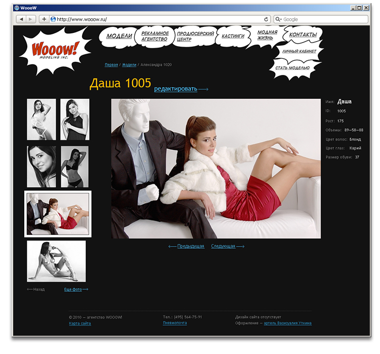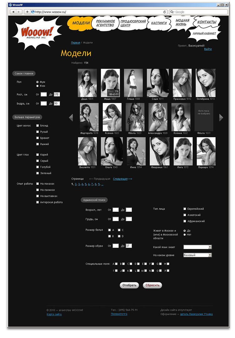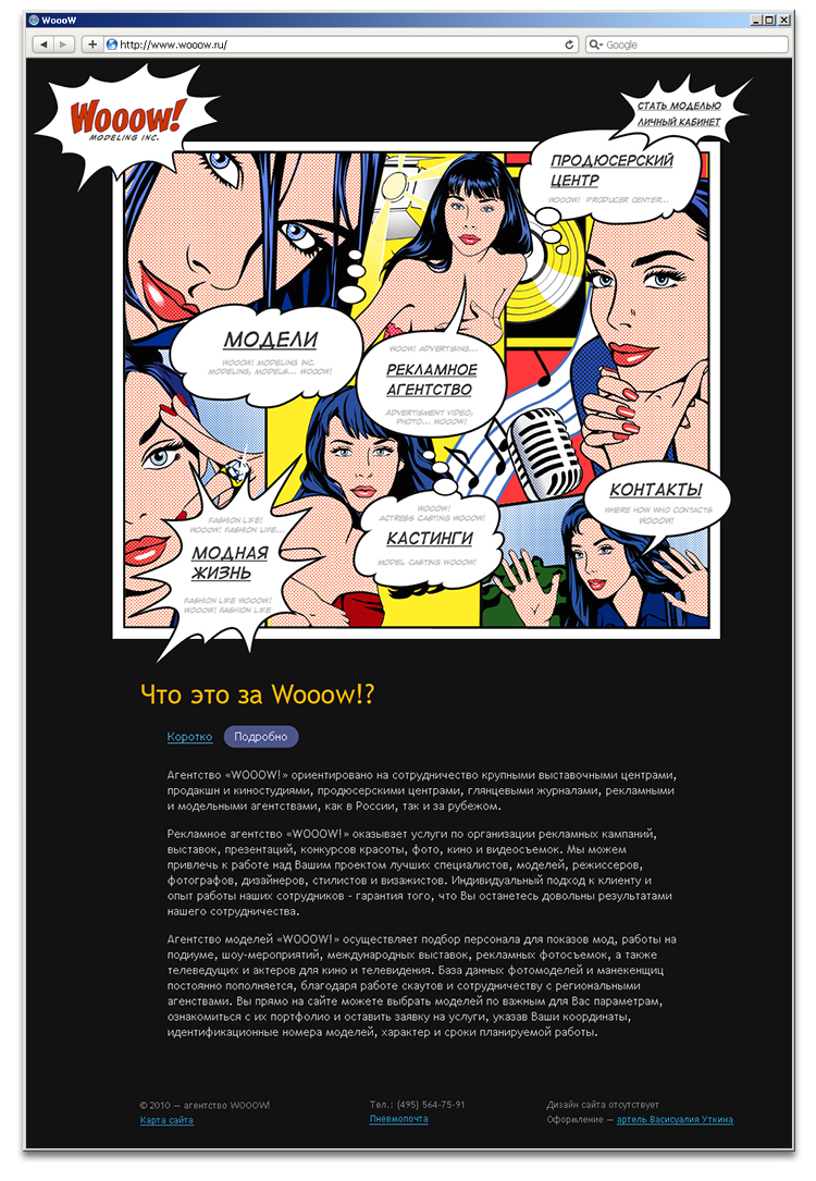 "Wooow!" от "Артели Васисуалия Уткина""Артель Васисуалия Уткина" создала для агентства "Wooow!", занимающегося поиском и подбором моделей, рекламной и продюсерской деятельностью, сайт с комиксами, а также разработала логотип и фирменный стиль."Wooow!" - новое модельное агентство, созданное продюсером фешн-индустрии Игорем Еворенко (в прошлом директор агентства Blizzard Models). Перед артелью стояла задача сделать для агентства "крутой" сайт - такой, чтобы каждая посетительница восхищенно говорила "Вааау!" и спешила зарегистрироваться. Как считают, в агентстве, комиксы в стиле Роя Лихтенштейна, ставшие ключевой идеей сайта, вполне подошли для этой задачи. Сайт работает не только на привлечение новых, самых лучших моделей, но и обеспечивает удобный подбор девушек по параметрам. Для посетителей сайта сделан пошаговый поиск, а для сотрудников агентства - поиск с разделителями, учитывающий множество дополнительных характеристик. Информация о каждой модели размещается на персональной странице, содержащей краткую справку о девушке и портфолио. Не смотря на важность имиджевой составляющей сайта, в процессе работы над проектом она отошла на второй план. Заказчик сразу обозначил главную задачу - сделать удобный каталог моделей, чтобы владелец агентства в любое время и в любой точке земного шара мог выбрать из существующей базы несколько моделей с заданными характеристиками. Параллельно с разработкой интерфейса в артели сделали логотип нового агентства. |