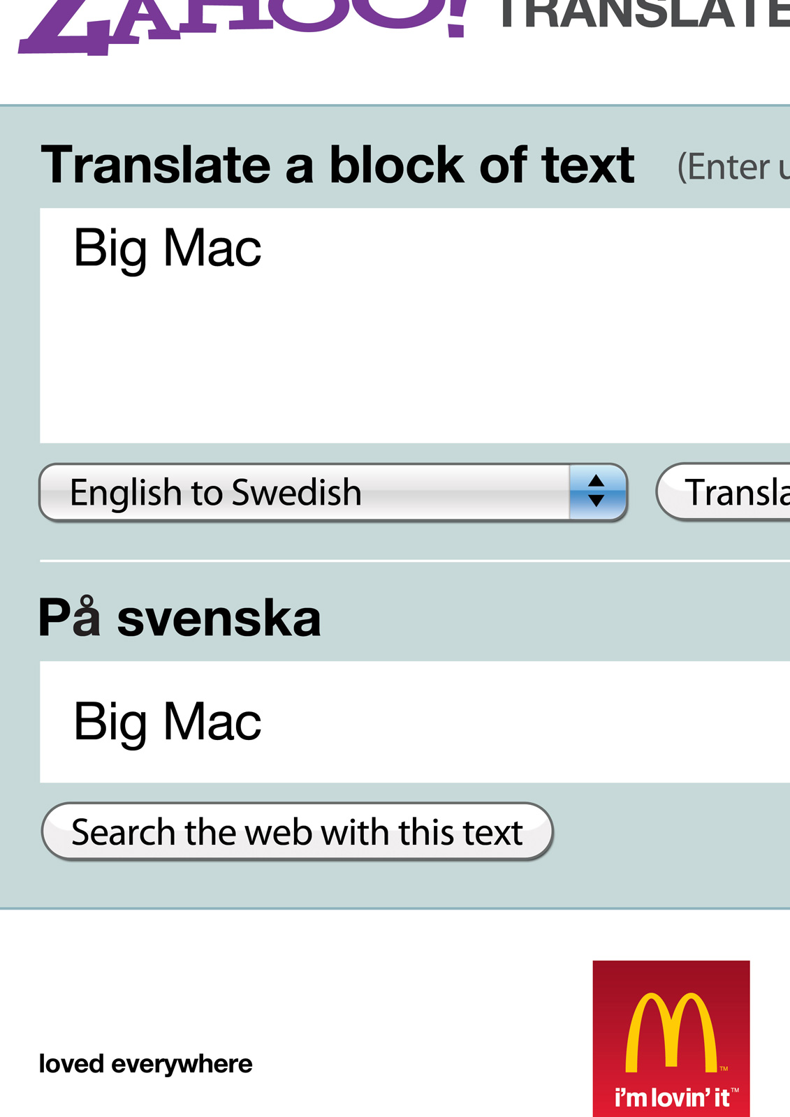 БигМак - он и в Африке БигМакНовая реклама McDonald's использует Интернет-переводчикDDB Bucharest разработало новую рекламу для крупнейшей сети фастфуда McDonald's. Суть кампании заключается в том, чтобы продемонстрировать клиентам, насколько глобальна эта сеть закусочных, и что во всем мире она одинаково вкусна и востребована. Для этого креаторы изобразили "скриншот" некоего онлайнового переводчика, в котором перевели название "Big Mac" с английского на шведский и получили ровно то же самое. Слоган подстраивается под основной девиз компании - "Любимо всюду". Кстати, в какой-то мере реклама является ко-брендинговой - хоть название переводчика и нельзя прочесть, по характерному шрифту в лого становится ясно, что это сервис Yahoo!, Однако первая буква видоизменена, так что официального партнерства с Интернет-компанией похоже нет. Часть логотипа приведена, по всей видимости, для того чтобы убедить потребителей в правдивости рекламы. Состав творческой группы Advertising Agency: DDB Bucharest, Romania Creative Director: Theodor Sandu Senior Copywriter: Corina Bacanu Copywriter: Romulus Petcan |