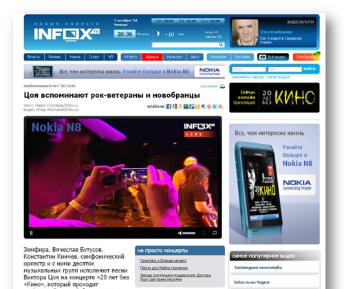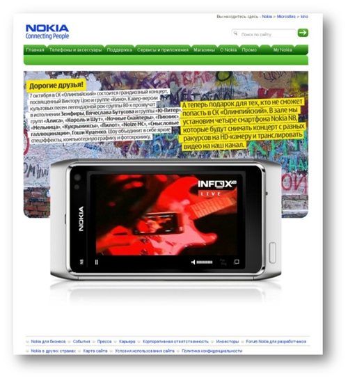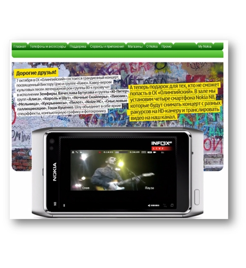 Nokia собрала "Олимпийский" в интернетеКомпания Nokia совместно с агентством Carat, реализация Carat Interactive, провели прямую трансляцию концерта "20 лет без "Кино", который проходил в СК "Олимпийский". В концерте приняли участие Вячеслав Бутусов и группа "Ю-Питер", "Алиса", "Король и Шут", "Ночные Снайперы", "Пикник", "Мельница", "Кукрыниксы", "Пилот", Noize MC, "Смысловые галлюцинации", Земфира, Гоша Куценко, а также Симфонический оркестр "Глобалис", который исполнил инструментальные версии группы "КИНО".Кампания проводилась при медийной и технической поддержке Infox.ru с целью продвижения новой модели телефона Nokia N8. Видео, выведенное в специальный раздел интернет-издания, смотрели почти 12 тысяч пользователей, что сопоставимо с аудиторией, собравшейся на стадионе. "Когда мы узнали, что в новом смартфоне Nokia N8 будет 12 Мпикс камера с оптикой Carl Zeiss и возможностью воспроизведения видео через HDMI , - говорит директор по группе клиентов агентства Carat Мария Сухоручкина, - мы загорелись идеей придумать проект, который бы позволил продемонстрировать возможности смартфона в области фото и видео, связав их с технологичностью бренда Nokia. Впервые удалось осуществить интернет трансляцию концерта, снятого на камеру смартфона". Уникальность мероприятия заключалась не только в качестве звука и картинки, которые создавали ощущение присутствия на концерте, но и в том, что впервые трансляция осуществлялась при помощи восьми смартфонов Nokia N8, установленных на сцене "Олимпийского". Яркие спецэффекты, известные нескольким поколениям песни, лучшая фотохроника "золотых" дней группы, потрясающая компьютерная графика - всё это с разных ракурсов смогли смотреть читатели Infox.ru и Nokia.ru в течение 3-х часового концерта.