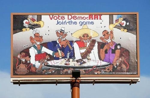 Барака Обаму изобразили в виде террориста, гомосексуалиста и бандитаПрезидента США Барака Обаму изобразили на билборде в виде террориста-смертника, гомосексуалиста, ганкстера и мексиканского бандита. Вывеска была размещена в городе Гранд-Джанкшн в штате Колорадо и вызвала возмущение представителей Демократической и Республиканской партии США.На скандальном плакате четыре персонажа: обмотанный взрывчаткой террорист-смертник, гомосексуалист с серьгой в ухе, гангстер с сиганой и мексиканский бандит играют в покер в окружении крыс и стервятников, а над ними размещен призыв: "Голосуй за демократов. Присоединяйся к игре" (Vote DemocRAT, Join the game). - "Это неприлично, и это неуважение по отношению к нашему президенту", - заявил член местной демократической партии Мартелл Дениэлс. По его мнению, плакат носит расистский и гомофобный характер. Карикатуру на Обаму нарисовал художник по имени Пол Сноувер (Paul Snover), однако заказчик остается неизвестным. Как сообщает Lenta.ru, художник отказался назвать его имя, сообщив, что не уполномочен делать это в настоящее время, неизвестным остается пока и имя человека арендовавшего билборд. Аналогичную позицию занял владелец билборда, на котором размещена карикатура. Предприниматель отказался назвать человека или организацию, арендовавшую у него рекламную площадь.
