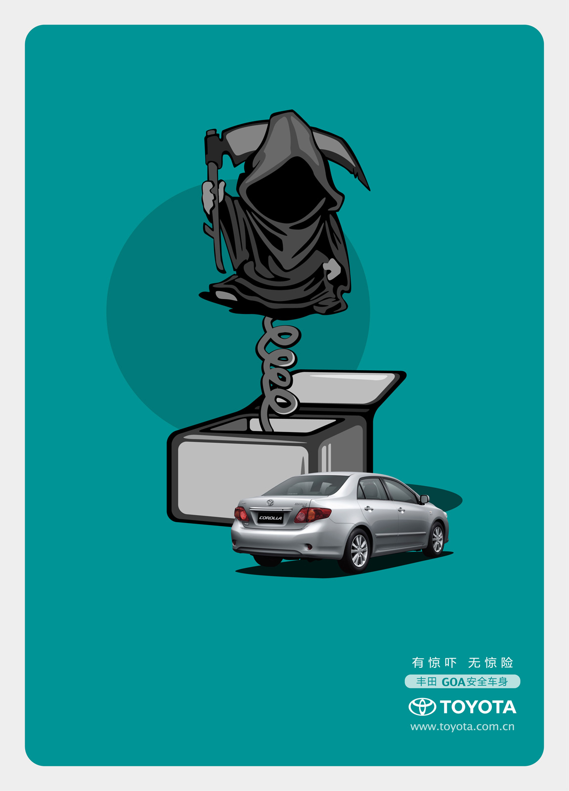 Владельцам Toyota смерть не страшнаРеклама системы безопасности автомобилей маркиПекинский офис агентства Dentsu создал рекламную кампанию для Toyota, в которой показал, что владельцам этих автомобилей смерть не так уж страшна. Реклама посвящена системе безопасности при ударе GOA или Global Outstanding Assessment, которая надежно защищает как водителя, так и пассажиров при неожиданном столкновении, когда невозможно успеть сгруппироваться самому. Благодаря этому опасность погибнуть снижается в разы, так что смерть пугает тех, кто ездит в Toyota не сильнее, чем чертик из коробочки. Состав творческой группы Advertising Agency: Dentsu, Beijing, China Creative Director: ArchiveLi, SamSun Art Director: Li Gang Copywriter: Sun Feng Tao Illustrator: Li Gang |