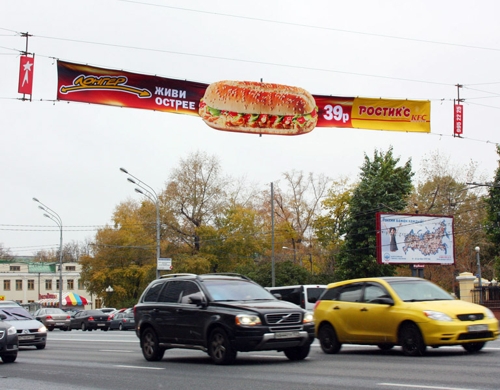 Московская Городская Реклама изготовила и разместила 13 перетяжек для сети ресторанов РОСТИК'С-KFC. На каждой из перетяжек расположен пластиковый экстендер длиной 4,3 метра, выполненный в виде сандвича Лонгер. |