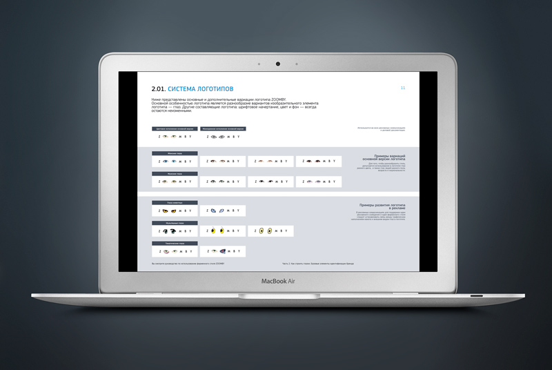 Основной особенностью логотипа является разнообразие вариантов изобразительного элемента логотипа - глаз. Другие составляющие логотипа: шрифтовое начертание, цвет и фон - всегда остаются неизменными. Основное правило подбора глаз в логотипе для использования в рекламных материалах - это сочетание их с контекстом рекламного сообщения. Глаза не обязательно должны быть человеческими, можно использовать глаза животных, насекомых, гуманоидов и так далее, если это сочетается с контекстом рекламного материала.