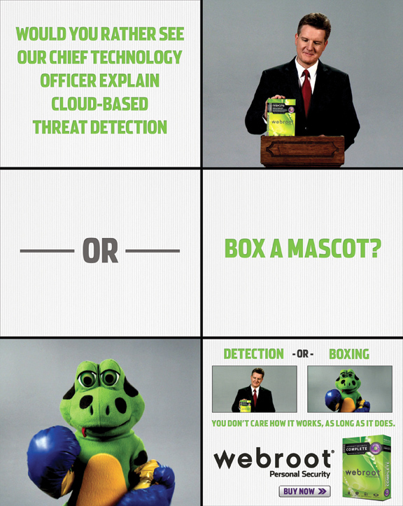 Компьютерная безопасность - это не так уж и скучноАгентство TDA Advertising&Design доказало, что антивирусное ПО может быть привлекательным для рядового потребителяЗабота о компьютерной безопасности - самое скучное занятие на свете. Никому нет дела до того как функционирует антивирусная защита, пока она работает. В своей первой рекламной кампании для разработчика антивирусного ПО Webroot, агентство TDA Advertising & Design представило целый сет занятной наружной рекламы. Каждый из билбордов предлагает взглянуть на типично неинтересную вещь, например, брокколи или сохнущую краску, а потом сравнить его с вариантом от Webroot - лекцией о фильтрации спама, о том, как работает антивирусная защита, о том, какой пароль подобрать, чтобы вашим логином не воспользовались хакеры и т.д. На некоторых принтах в качестве главного действующего лица выступает начальник техотдела Webroot - Майк Кроненберг (Mike Kronenberg), который готов "объяснить облачные технологии определения кибер-угрозы" или "побоксировать с плюшевым аллигатором", "поучаствовать в механическом родео" или "посвятить в основы идеальной временной развертки". Стоит отметить, что на фоне весьма обыденных вещей предлагаемые технические подробности звучат интригующе. Что это за таинственные облачные технологии определения кибер-угрозы? Webroot определенно знает как зацепить рядового потребителя. Напомним, что компания Webroot Software - разработчик ПО в секторе компьютерной безопасности - в августе этого года передала свой креативный маркетинг вкупе с 5 млн.долл. бюджета рекламному агентству TDA Advertising & Design, которое теперь отвечает за наружную и он-лайн рекламу, размещение товара и партизанский маркетинг. Алена Лащ, Sostav.ru