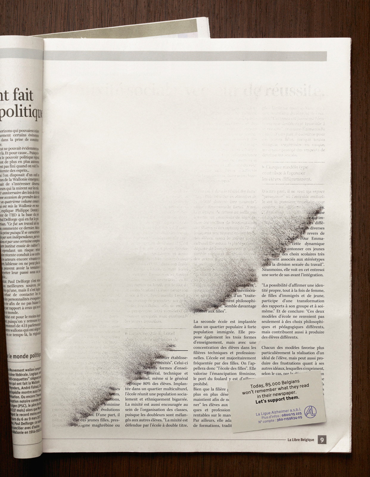 Альцгеймер стирает газетные статьиНовая кампания в поддержку людей, страдающих от болезни АльцгеймераБлаготворительная организация Belgian League of Alhzeimer и агентство Publicis Brussels выпустили новую кампанию, призывающую людей помочь тем, кто страдает от тяжелого заболевания - болезни Альцгеймера. Реклама рассказывает, что на сегодняшний день в Бельгии около 85 тысяч человек не помнят даже содержание газеты, которую они только что прочитали. Всем этим людям требуется помощь, уход и поддержка. Ранее Sostav.ru не раз писал о социальной рекламе подобной тематики. Особенно активна в этом плане ассоциация France Alzheimer, чья реклама зачастую по-настоящему пугающая Состав творческой группы Advertising Agency: Publicis, Brussels, Belgium Creative Directors: Alain Janssens, Paul Servaes Art Director: Sophie Norman Copywriter: Nathalie Delchambre Photographer: Jean-Franzois de Witte Graphic design: Christophe Vantricht |