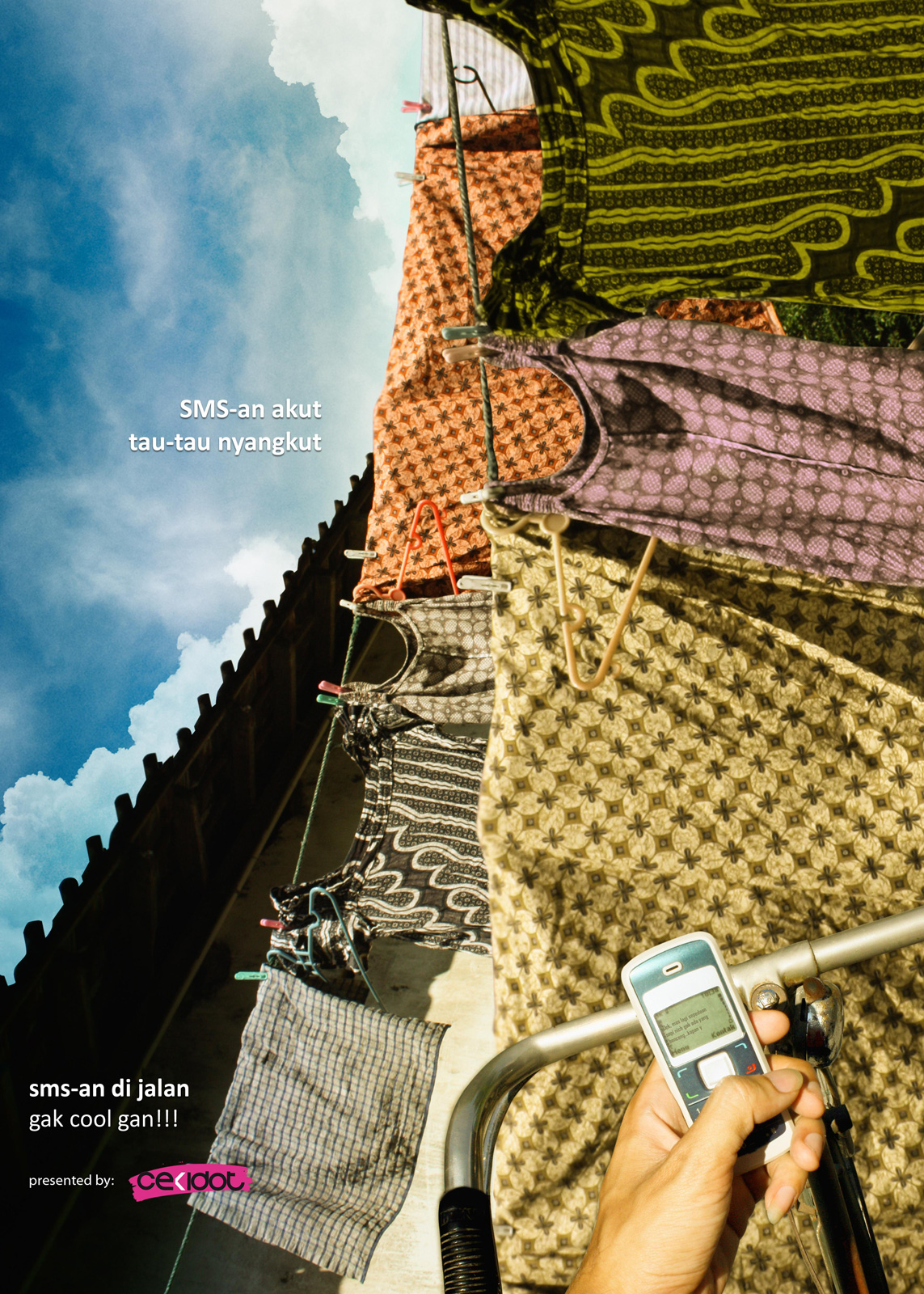 Авария из-за SMS - это не крутоНовая кампания против SMS-переписки за рулемИндонезийское агентство Existcomm выпустило серию принтов, направленных на предотвращение ДТП из-за того, что водители отвлекаются на переписку по мобильному телефону. Социальные кампании на эту тему достаточно популярны, особенно в Новой Зеландии, так как проблема невнимательности молодых водителей из-за СМС там очень актуальна. По всей видимости, в Индонезии также существует эта проблема, и авторы кампании решили показать молодежи, что ДТП из-за мобильника - это совсем не круто. Состав творческой группы Advertising Agency: Existcomm, Yogyakarta, Indonesia Creative Director: Margareta Wulandari Art Director: Nanda Giftanina Copywriter: L. Acynthia Putri |
