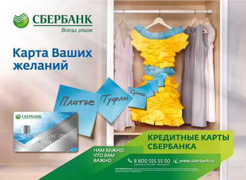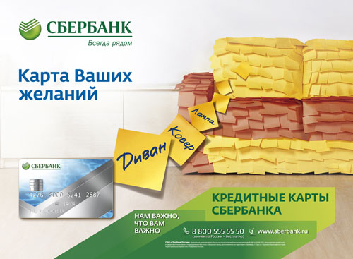 McCann Erickson и Сбербанк исполняют желанияАгентство McCann Erickson разработало новую рекламную кампанию для кредитных карт Сбербанка России. Сбербанк впервые начинает массовый выпуск кредитных карт. Теперь кредитную карту Сбербанка может оформить любой гражданин РФ старше 21 года и удовлетворяющий всем требованиям банка. Для продвижения данного продукта креативное агентство McCann Erickson, которое ведет бренд с июля 2009 разработало коммуникацию, в основе которой лежит простая идея о том, что кредитные карты исполняют желания людей. Как рассказывают в агентстве, основная сложность проекта заключалась в поиске простой и понятной визуализации желаний. Решение было найдено в виде обычных клеящихся стикеров, на которых мы часто пишем свои планы, намерения, желания. Эти стикеры и стали связующим звеном между потребителем и продуктом - "Картой ваших желаний" Сбербанка. Рекламная коммуникация была реализована в федеральном ТВ, прессе, наружной рекламе, радио и Интернете. Старт кампании - 8 ноября. Состав творческой группы: