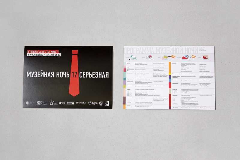 Музейная ночь прошла "с галстуками"Компания SmartHeart приняла участие в разработке рекламной кампании 17 музейной ночи "Серьезной".Музейная ночь проходила в Красноярске с 6 на 7 ноября. Мероприятие каждый раз становится одним из наиболее ярких культурных событий города и края. Тема и концепция ночи были предложены дирекции музея в ответ на потребность сделать событие менее похожим на "тусовку" с разнородным содержанием, превратив его в настоящую культурную площадку современного искусства. Визуальным решением концепции был предложен образ строгого галстука, который стал узнаваемым символом мероприятия. Специалистами SmartHeart была разработана комплексная рекламная кампания, включающая в себя современные инструменты маркетинговых коммуникаций. Стилизованные галстуки наклеивались на изображения людей в городской среде и наружной рекламе. Таким образом Музейную ночь неожиданно для себя прорекламировали Денис Симачев, R'N'B певица Елка, модели из рекламы Calvin Clein и множество других публичных персон, ежедневно смотрящих с рекламных изображений. В агентстве отмечают, что наклейки легко удалялись, и акция ни в коем случае не была вандальной. Так же в рамках рекламной кампании, специалисты SmartHeart предложили интерактивную инсталляцию "Галстуки", гармонично дополнившую внешний образ музейной ночи. Инсталляция обыгрывает тему серьезного-несерьезного, превращая привычный атрибут делового человека в элемент игры и виртуального кокетства. Семнадцатая Музейная ночь получила широкое освещение в прессе. Репортажи о ней вышли в эфире Первого канала, канала Россия, НТВ и многих других. |
