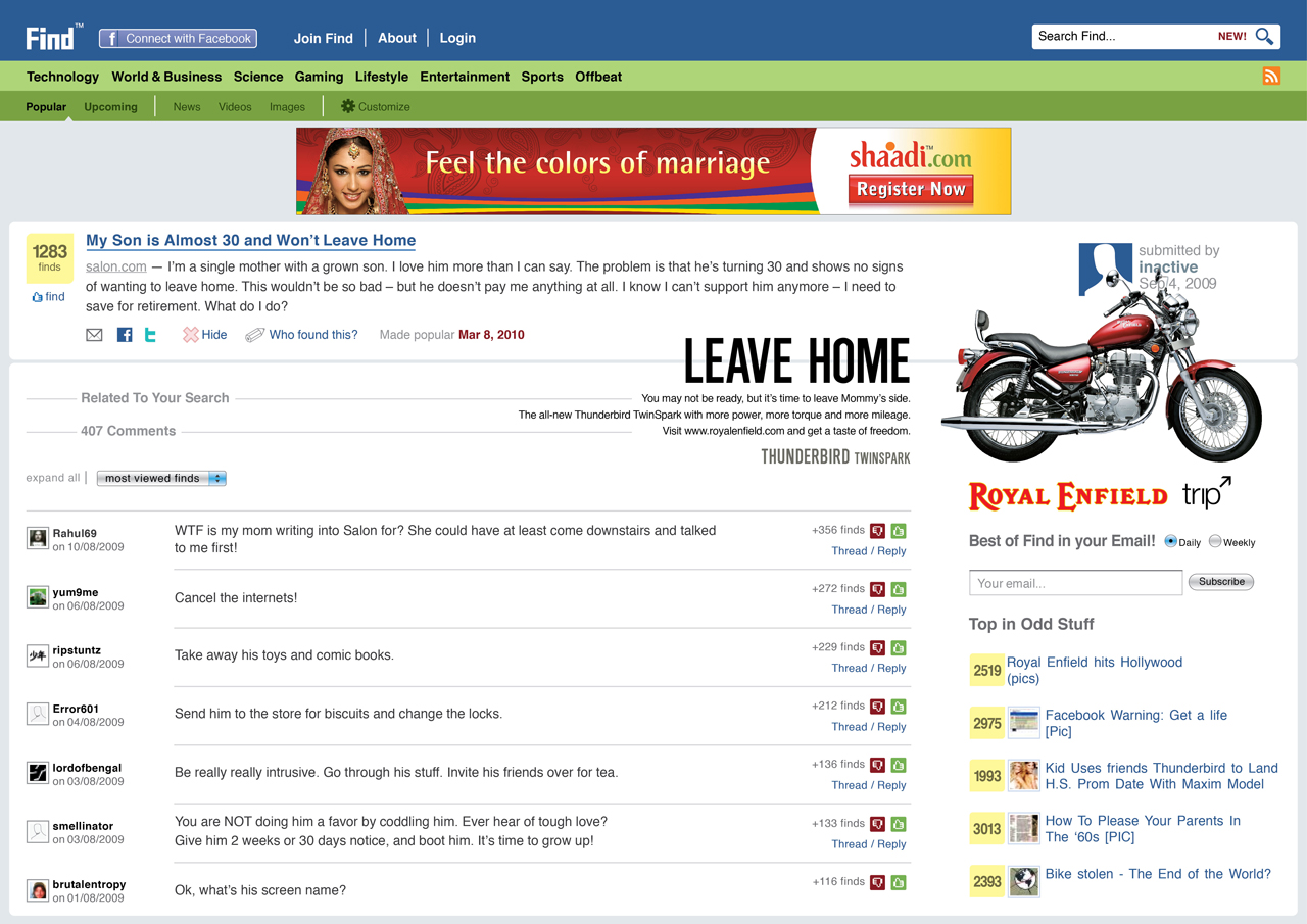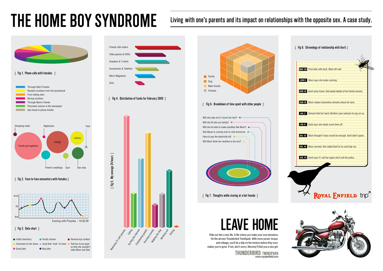 Мотоциклы Royal Enfield призывают покинуть домЮмористическая кампания показывает, что нет смысла всю жизнь жить с родителямиИндийское Wieden + Kennedy Delhi создало интересную кампанию для рекламы мотоциклов Royal Enfield. Общий посыл проекта заключается в том, чтобы воодушевить молодых людей на самостоятельную жизнь и покидать отеческий дом. Креаторы выпустили три совершенно разных принта, объединенных идеей того, что мотоцикл - отличное решение проблемы домоседства. На первом изображен скриншот с форума, где мать спрашивает совета, как заставить ее 30-летнего сына начать жить самостоятельно. На втором приведены различные графики и схемы, отражающие унылость подобно жизни для молодого человека. Ну, а на третьем принте как раз показано, какой интересной может стать жизнь, если взять мотоцикл и начать путешествовать. Состав творческой группы Advertising Agency: Wieden + Kennedy Delhi, India Executive Creative Director: V Sunil Art Director:Daniel Berkowitz Copywriter: Nirmal Pulickal |