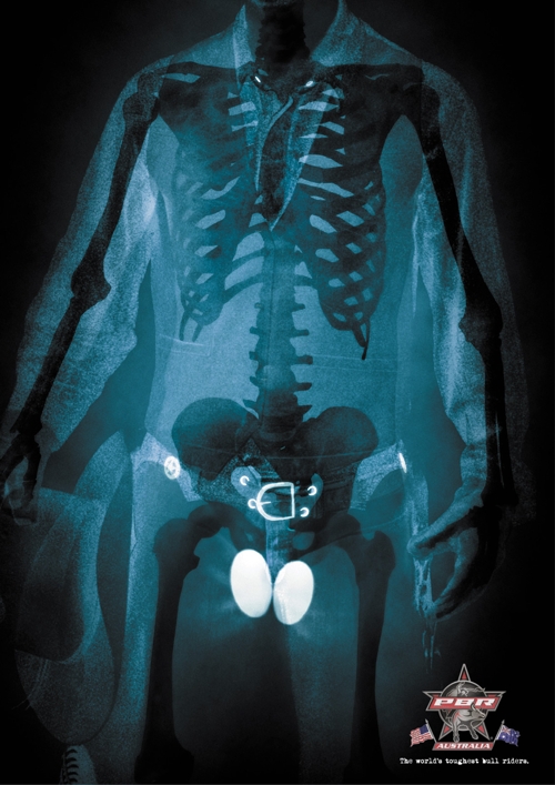 Рентген показал, что у крутых ковбоев - крутые яйцаРеклама австралийского родео с пошловатым юморомАвстралийское агентство Kastner and Partners использовало интересный образ для рекламы родео Professional Bull Riders, которое пользуется в Австралии большой популярностью. Рекламисты изобразили на принте рентгеновский снимок ковбоя, с помощью которого без труда доказали, что наездники в этом родео - настоящие храбрецы знатоки своего дела. Для этого было обыграно расхожее выражение в английском языке, в котором отвага и крутизна человека сравнивается с крепостью сваренных вкрутую яиц. Разумеется, без грубого юмора и двусмысленности здесь не обошлось. Состав творческой группы Advertising Agency: Kastner and Partners, Sydney Australia Creative Director: Ben O'Brien Art Director: Dan Foster Copywriter: Ben O'Brien Photographer: Jeremy Park Additional credits: Retouching: Marcus Thyer |