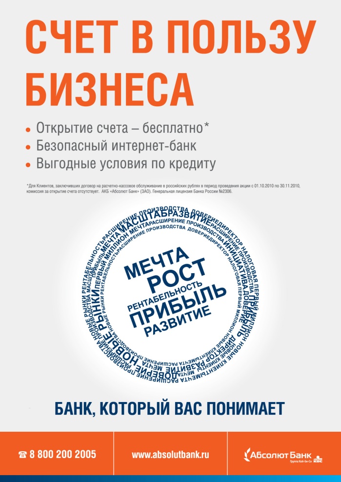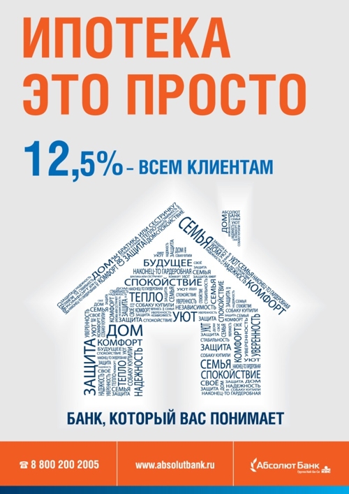 Абсолют Банк представил новую рекламную концепциюВ начале октября 2010 г. стартовала новая рекламная кампания Абсолют Банка в поддержку ипотеки, продуктов для малого и среднего бизнеса, а в начале ноября кампания усилилась акцией по вкладам. Кампания проходит под лозунгом "Банк, который вас понимает". Слоган является логичным развитием девиза весенней кампании - "Банк и клиент: лицом к лицу". Рекламное продвижение новых продуктов запущено в федеральном масштабе. Главные задачи - повысить узнаваемость бренда, увеличить количество продаж и привлечь новых клиентов. Идея новой рекламной кампании принадлежит креативному агентству IQ Marketing. Перед специалистами была поставлена задача - соблюсти уважительный и человечный тон, одновременно подчеркнув профессионализм и надежность Банка. Вместе с этим, концепция должна была заметно выделиться из общего потока рекламных сообщений. Агентство предложило отстроиться от прочей рекламы на рынке за счет ключевого элемента - использования в качестве изображения пиктограмм продуктов, составленных из близких целевой аудитории слов. При их выборе особое внимание уделялось эмоциональной составляющей - например, для ипотеки это "семья", "уют", "спокойствие", "будущее", "мечта". Практическая полезность продуктов также не осталась без внимания - в пиктограммах использовались слова "рентабельность", "прибыль", "развитие", "дом". "Мы говорим с клиентом на одном языке - это главное, что мы хотели отразить в нашей рекламе и у нас это получилось. Этому вторит и слоган осенней кампании "Банк, который Вас понимает", - комментирует руководитель департамента коммуникаций Абсолют Банка Юлия Остроухова,- "Мы старались отойти от традиционных картинок и счастливых лиц. В результате макеты получились стильными, инновационными и неожиданными. Хотелось бы подчеркнуть, что новая рекламная концепция отражает философию бренда Абсолют Банка, а именно, быть надежным финансовым партнером для наших клиентов в разные моменты жизни". По результатам независимого анализа концепции, проведенного Абсолют Банком совместно с НАФИ путем фокус-групп, рекламные сообщения получили высокие оценки. Участников обсуждений впечатлила оригинальность и нетипичный подход к рекламе банковских услуг. Участники фокус-групп отметили, что концепция в силу оригинальности рассчитана не столько на массовый сегмент, сколько на активных, представительных и деловых людей с доходом выше среднего, разбирающихся в банковских услугах, для которых важна не столько прибыльность сбережений, сколько надежность и стабильность банка. Кампания осуществляется в Москве и еще 11 регионах присутствия Банка. Основными носителями являются: наружная реклама - щиты 3х6, перетяжки с экстендерами, крупные форматы, экраны; пресса - свыше 30 федеральных и региональных изданий; радио - региональные радиостанции; интернет - поисковая оптимизация, контекстная реклама, баннерная реклама, таргетированные почтовые рассылки. Визуал акции по вкладам Банк разрабатывал уже самостоятельно, взяв за основу концепцию IQ Marketing. "В кампанию по вкладам мы хотели добавить праздничное настроение. Это нам удалось за счет еловой ветки, на которой в виде новогодней игрушки качается пластиковая карточка Абсолют Банка", - комментирует Остроухова.