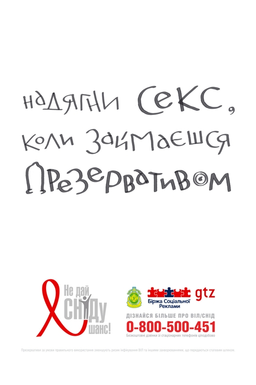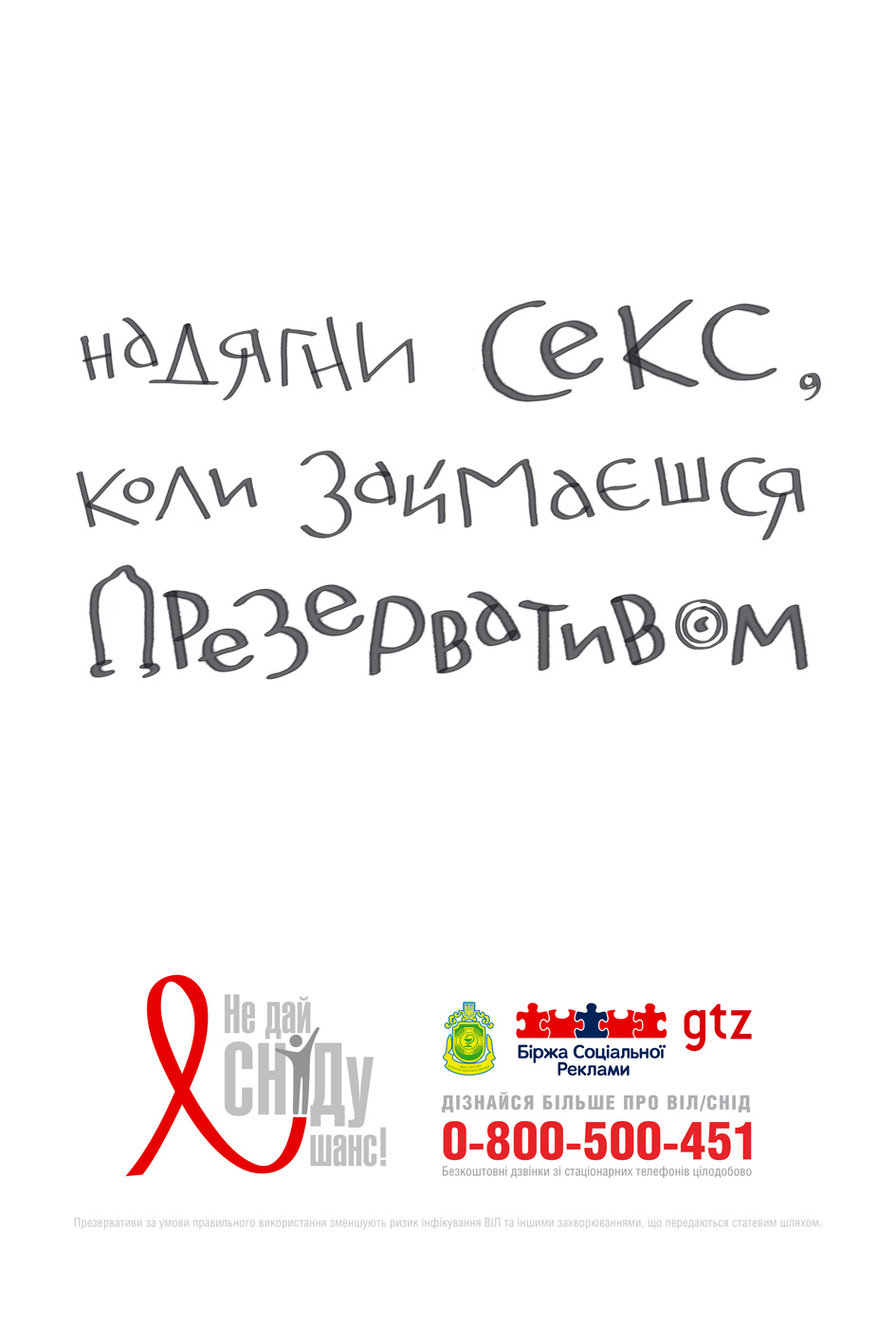 TABASCO снова делает это с презервативомВ ноябре 2010 года стартовала вторая волна национальной кампании "Не дай СНИДу шанс" от Министерства Охраны Здоровья Украины и немецкого бюро технического сотрудничества GTZ. Креативная идея разработана агентством TABASCO. Первая волна кампании стартовала в апреле 2010 года, идея кампании была отобрана через тендер Биржи Социальной Рекламы.Дополнительные материалы: имиджи второй кампании