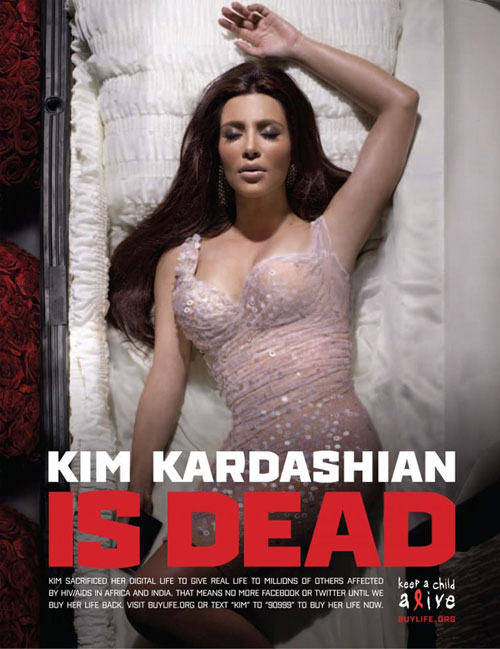 "Виртуальная смерть" знаменитостей не останется незамеченной - уже сейчас появившиеся в сети фотографии Ким Кардашьян, лежащей в гробу, вызвали ажиотаж среди пользователей кибер-пространства. 30-летняя звезда реалити-шоу "пожертвовала свою виртуальную жизнь, чтобы подарить реальную жизнь миллионам зараженных ВИЧ и СПИД в Африке и Индии", говорится в объявлении. "Посетите BuyLife.org или отправьте "KIM" на номер 90999, чтобы подарить ей жизнь".