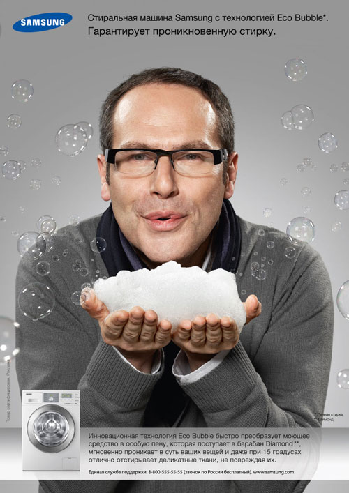 Михаил Шац проводит опыты с техникой SamsungАгентство Leo Burnett Moscow разработало рекламную кампанию в поддержку стиральной машины Samsung с функцией Eco Bubble. В роли эксперта выступил телеведущий Михаил Шац. В рамках кампании снят ролик "Пузыри" (20" и 30") и разработан макет в прессу. Главным героем кампании стал телеведущий Михаил Шац, который продолжает ставить эксперименты со стиральными машинами Samsung.