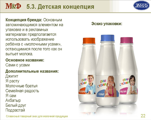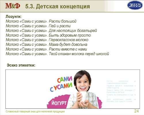 "Мелехов и Филюрин" CYT молокоДля производителя молочной продукции из Казахстана - компании "Эмиль" специалистами Рекламной группы "Мелехов и Филюрин" была разработана новая торговая марка. Агентством был проведен комплекс работ, включавший в себя: разработку концепции бренда, разработку названия и дизайн этикетки. По-казахски слово "CYT" означает "молоко". На первом этапе клиенту было предоставлено пять концепций бренда с подходящими названиями. Из тридцати семи названий клиенту предстояло выбрать одно. В концепцию бренда входили наброски будущих рекламных материалов: слоганов, плакатов, видеороликов и упаковки продукции. На этих слайдах из презентации приведены иллюстративные материалы. На втором этапе был создан дизайн упаковки. В логотипах "Буренкины мечты" разработаны оригинальные шрифтовые начертания. Чтобы не затруднять читаемость довольно длинного и непривычного словосочетания, за основу взяты достаточно нейтральные шрифты из семейства "гротеск", в которые добавлены диагональные ритмические нюансы, соответствующие ритмам остальных элементам композиции этикеток. На варианте с центральносимметричной композицией для наименования продукта также создано оригинальное написание. На третьем этапе клиент провел тестирование дизайна в нескольких торговых точках Усть-Каменогорска. Для этого ограниченным тиражом была выпущена небольшая партия продукта с измененным названием.
