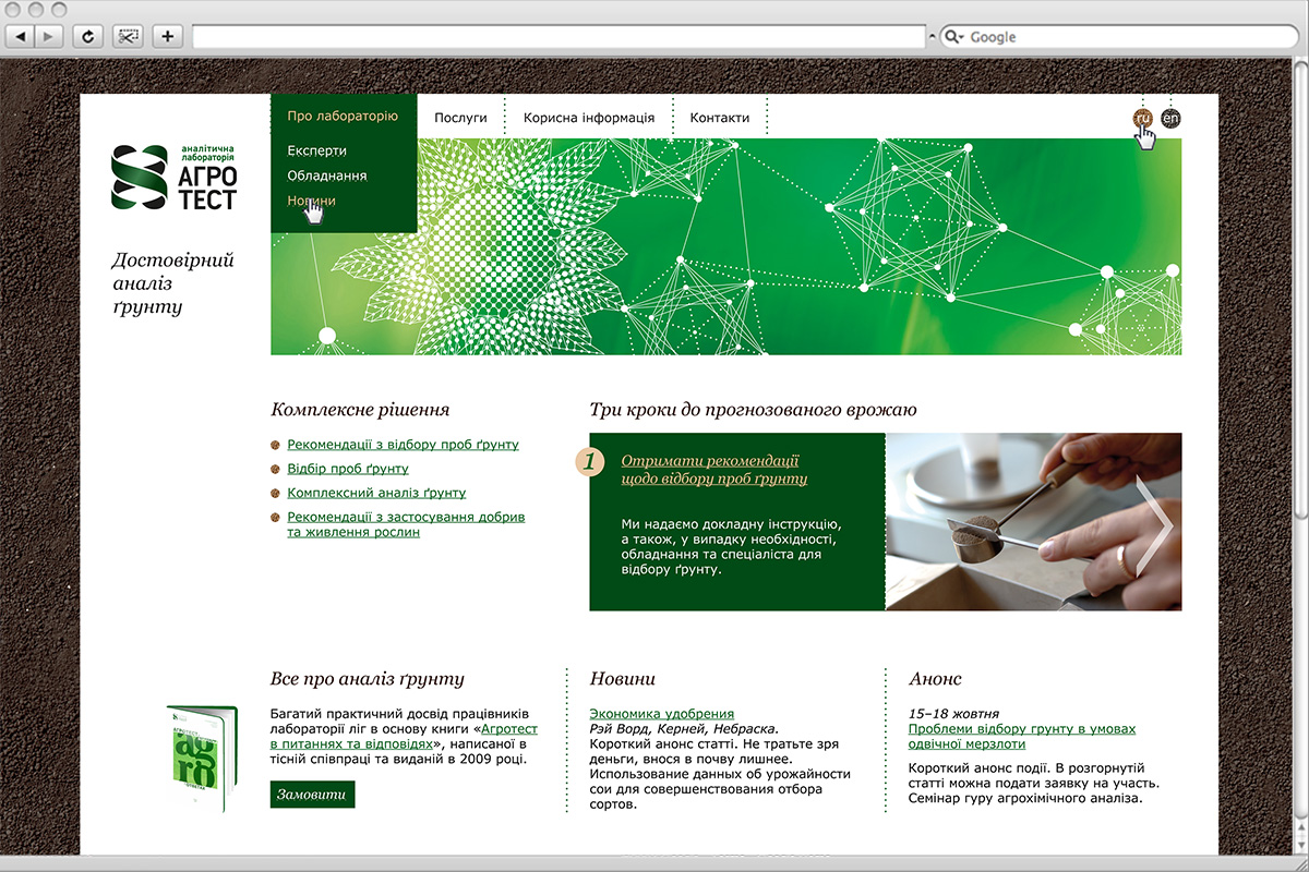 Модели молекул превратили в дизайнерский рисунокДизайнерам мастерской дизайна "Короливськи мытци" в этом году пришлось изрядно покопаться в земле. В результате появился урожай - фирменный стиль для агрохимической лаборатории "Агротест". Лаборатория предлагает полный комплекс услуг, связанных с химическим анализом почвы. В агентстве говорят, что созданный стиль объединяет темы химии, земли и растениеводства. Качественный анализ почвы - основа урожая. Аналитическая химия в основе качественных растений. Фирменные паттерны напоминают собой модели молекул. Этот же принцип использован для изображения растений. Почва разных оттенков используется как фон на многих носителях визуально идентификации лаборатории, а также для создания фирменных иллюстраций. Состав творческой группыАрт-директор: Дмитрий Король Дизайнер: Виктория Король |