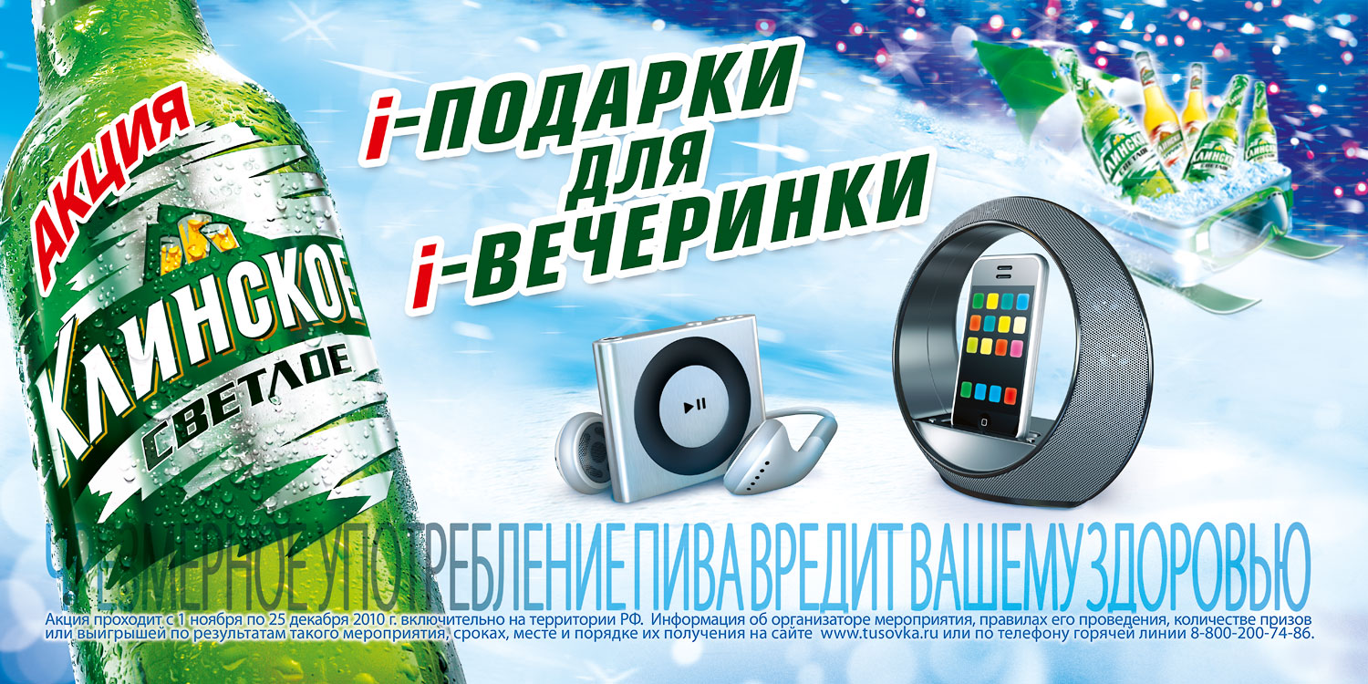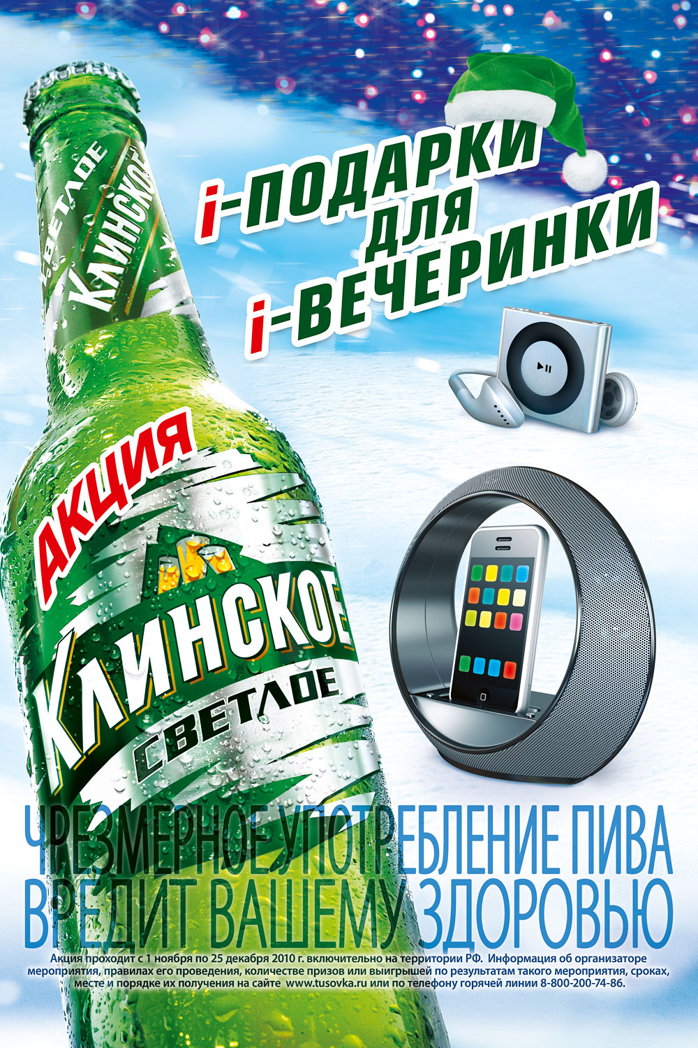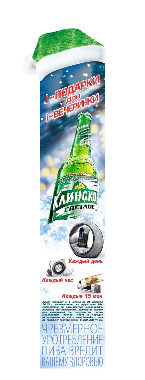 i-кампания для i-Клинского от Grey MoscowИдея о том, что пиво "Клинское" (бренд компании "САН ИнБев") само придет на новогоднюю вечеринку легла в основу новогодней рекламной акции бренда "Клинское "i-подарки для i-вечеринки", стартовавшей в начале ноября. Креативная концепция рекламных материалов была разработана агентством Grey Moscow, под контролем которого также проходили съемки новогоднего промо-ролика, производство макетов OOH, Digital и POS-материалов.