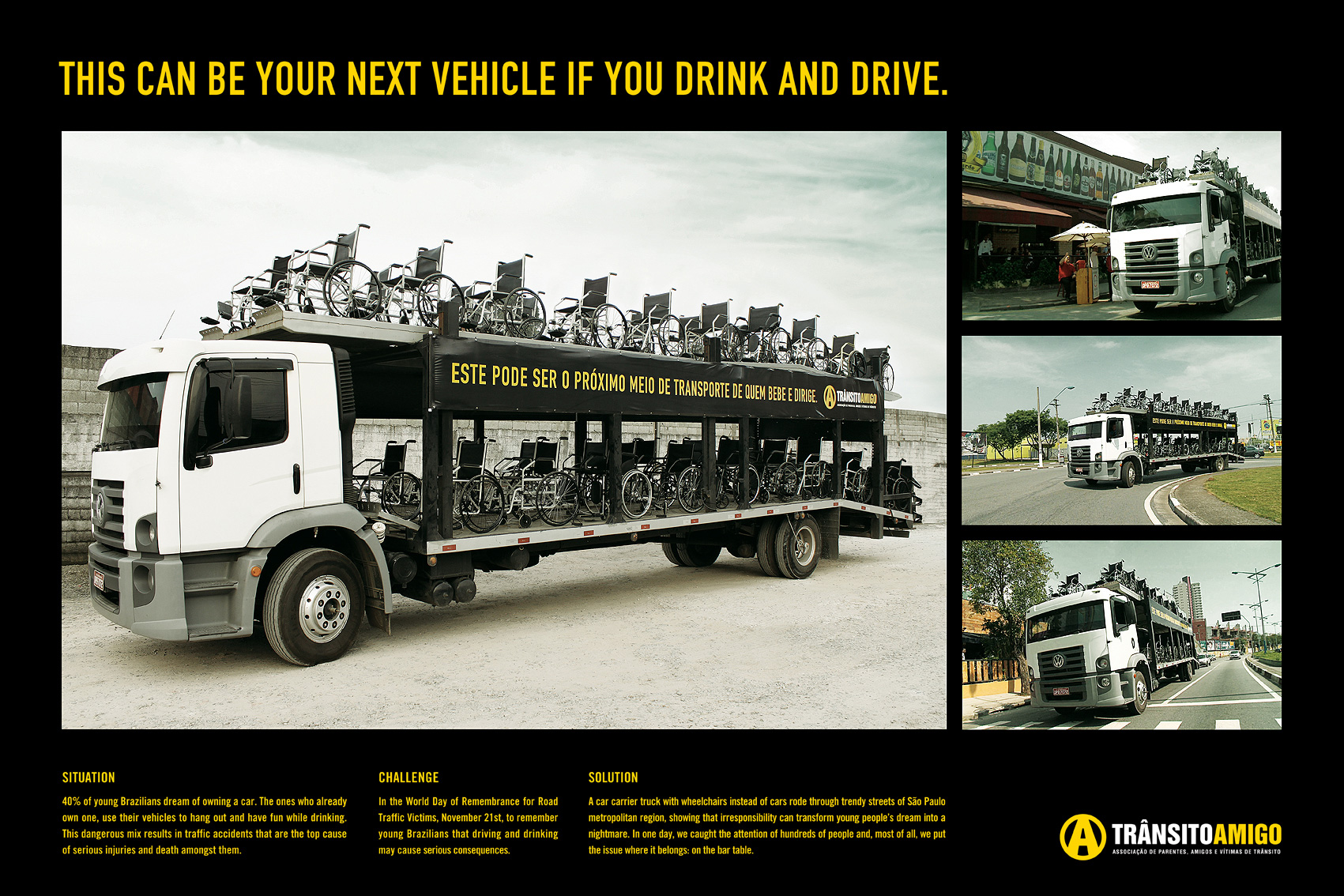 Тягач с инвалидными колясками напомнил об аккуратном вожденииСоциальный проект общества Transito AmigoВ Бразилии прошла любопытная социальная кампания, организованная обществом Transito Amigo и рекламным агентством Ageisobar. В рамках Дня памяти жертв дорожных происшествий, который прошел 21 ноября, Transito Amigo решили напомнить молодым водителям, что они рискуют своей и чужими жизнями, если садятся за руль пьяными. Для этого креаторы выпустили на дороги Сан-Паулу тягач с прицепом, полным инвалидных колясок. Надпись на боку прицепа гласила: "Это может быть твоим следующим транспортным средством, если ты будешь пить за рулем". Состав творческой группыAdvertising Agency: Ageisobar, Sao Paulo, Brazil Creative Director: Carlos Domingos Art Directors: Cristiano Rodrigues, Tales Lima, Fuku, Henrique Mattos Copywriters: Charles Faria, Daguito Rodrigues |