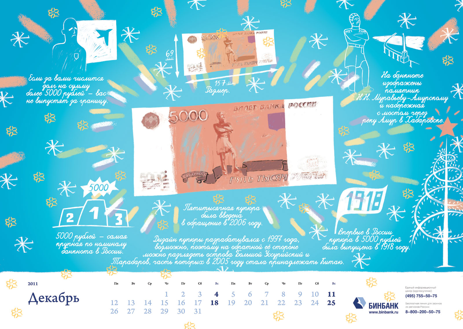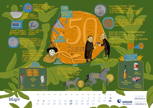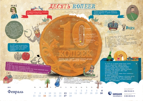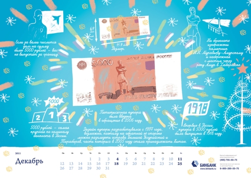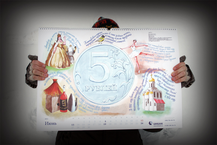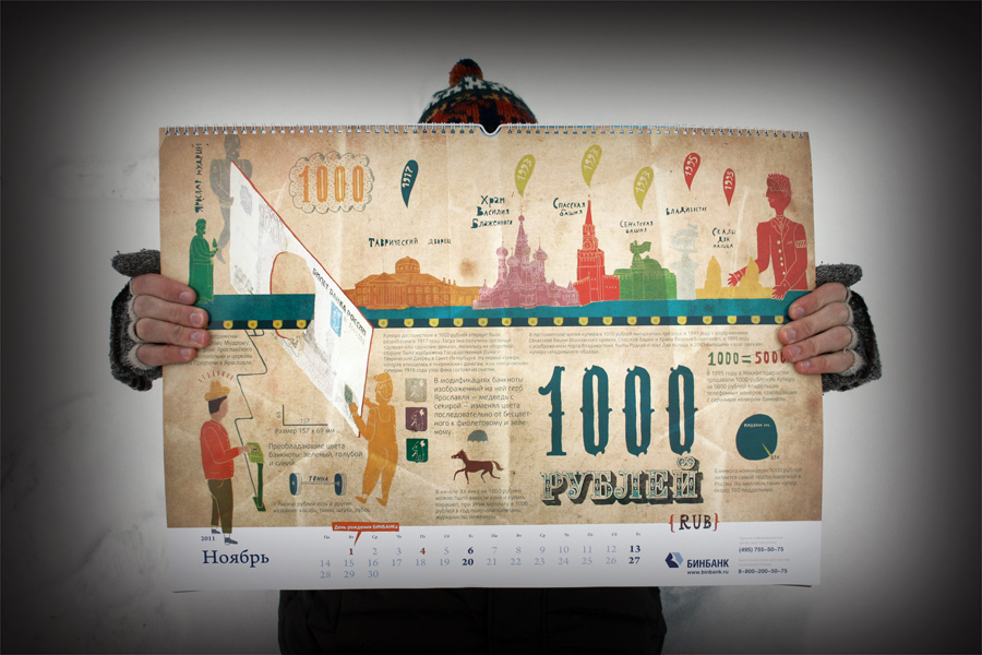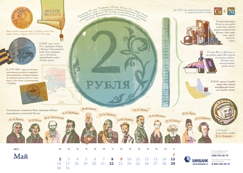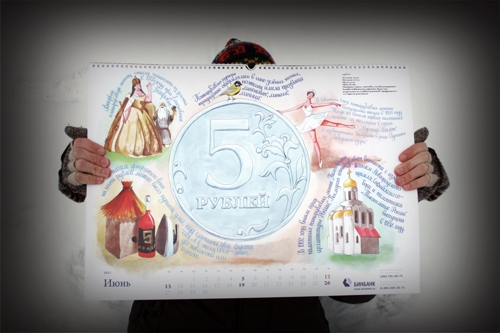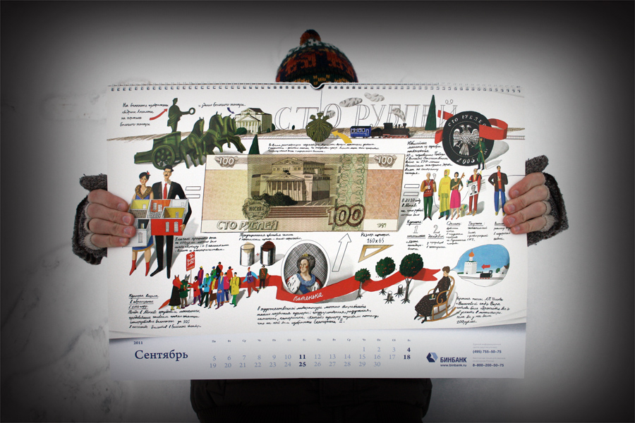 Энциклопедия современных российских денег в формате календаряАгентство MOST Creative Club подготовил для БинБанка "Энциклопедию современных российских денег" в формате календаря. Каждая страница календаря посвящена отдельной банкноте или монете, имеющейся в обращении в современной России. Помимо основной информации о денежном знаке, вроде веса монеты или размера купюры, на каждой странице указаны важные исторические и несерьезные анекдотические факты. Например, можно узнать, за какое время сгорает пятисотрублевая купюра, сколько нужно времени, чтобы нарисовать капиллярной ручкой 50-рублевую банкноту, какая купюра является самой подделываемой в России и многое другое. Над оформлением календаря работали 12 разных дизайнеров из России, Франции и Израиля, каждый из которых готовил по одной странице. |