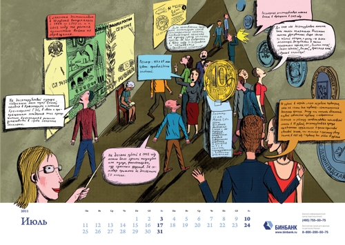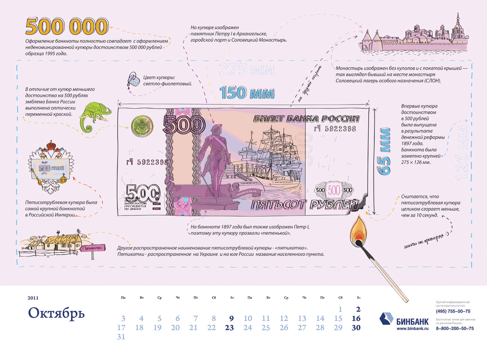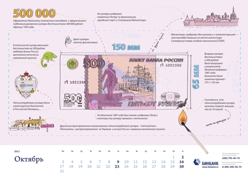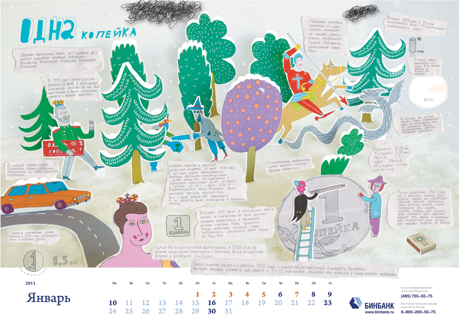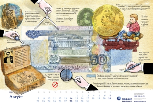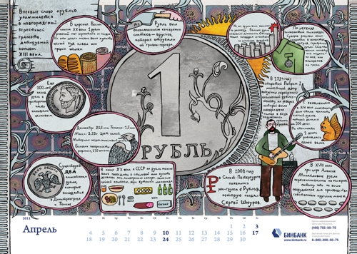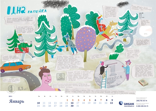 Энциклопедия современных российских денег в формате календаряАгентство MOST Creative Club подготовил для БинБанка "Энциклопедию современных российских денег" в формате календаря. Каждая страница календаря посвящена отдельной банкноте или монете, имеющейся в обращении в современной России. Помимо основной информации о денежном знаке, вроде веса монеты или размера купюры, на каждой странице указаны важные исторические и несерьезные анекдотические факты. Например, можно узнать, за какое время сгорает пятисотрублевая купюра, сколько нужно времени, чтобы нарисовать капиллярной ручкой 50-рублевую банкноту, какая купюра является самой подделываемой в России и многое другое. Над оформлением календаря работали 12 разных дизайнеров из России, Франции и Израиля, каждый из которых готовил по одной странице. |