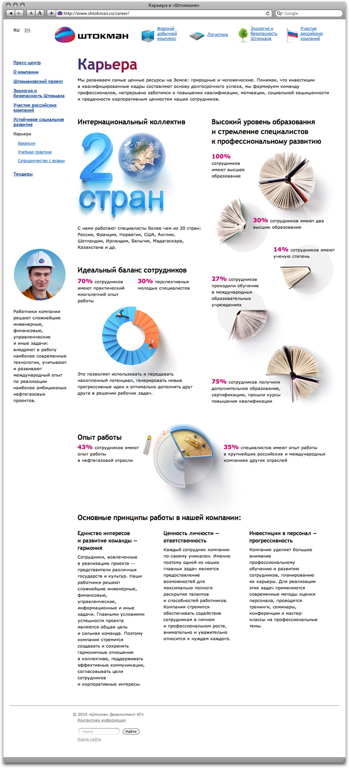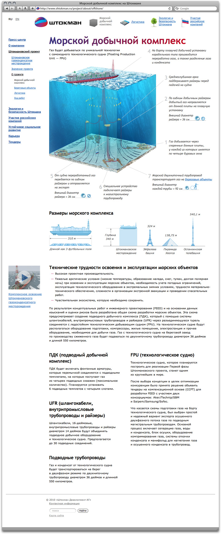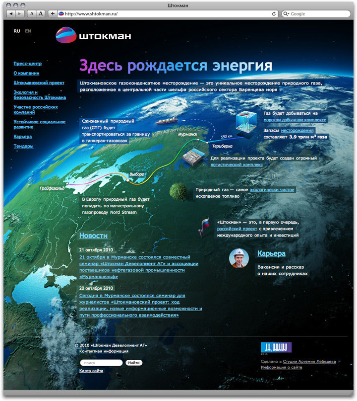 "Штокман" создали в Студии ЛебедеваВ Студии Лебедева завершили создание сайта для "Штокмана" - это название проекта по добыче и транспортировке газа Штокмановского газоконденсатного месторождения в Баренцевом море. В течение ближайших семи лет на севере России будут создаваться и вводиться в строй различные части проекта. Как сказано на официальном сайте Студии, на главной странице показано, где географически расположено месторождение и какими способами газ после добычи будет попадать в Россию и Европу. Главный элемент проекта - морской добычной комплекс: с огромной плавучей установки в суровых арктических условиях будет добываться газ. Одна из важнейших частей проекта - работа с людьми. Сайт будет использоваться для привлечения квалифицированных специалистов, потенциальным кандидатам рассказывают про будущую работу на нескучном языке круговых диаграмм.