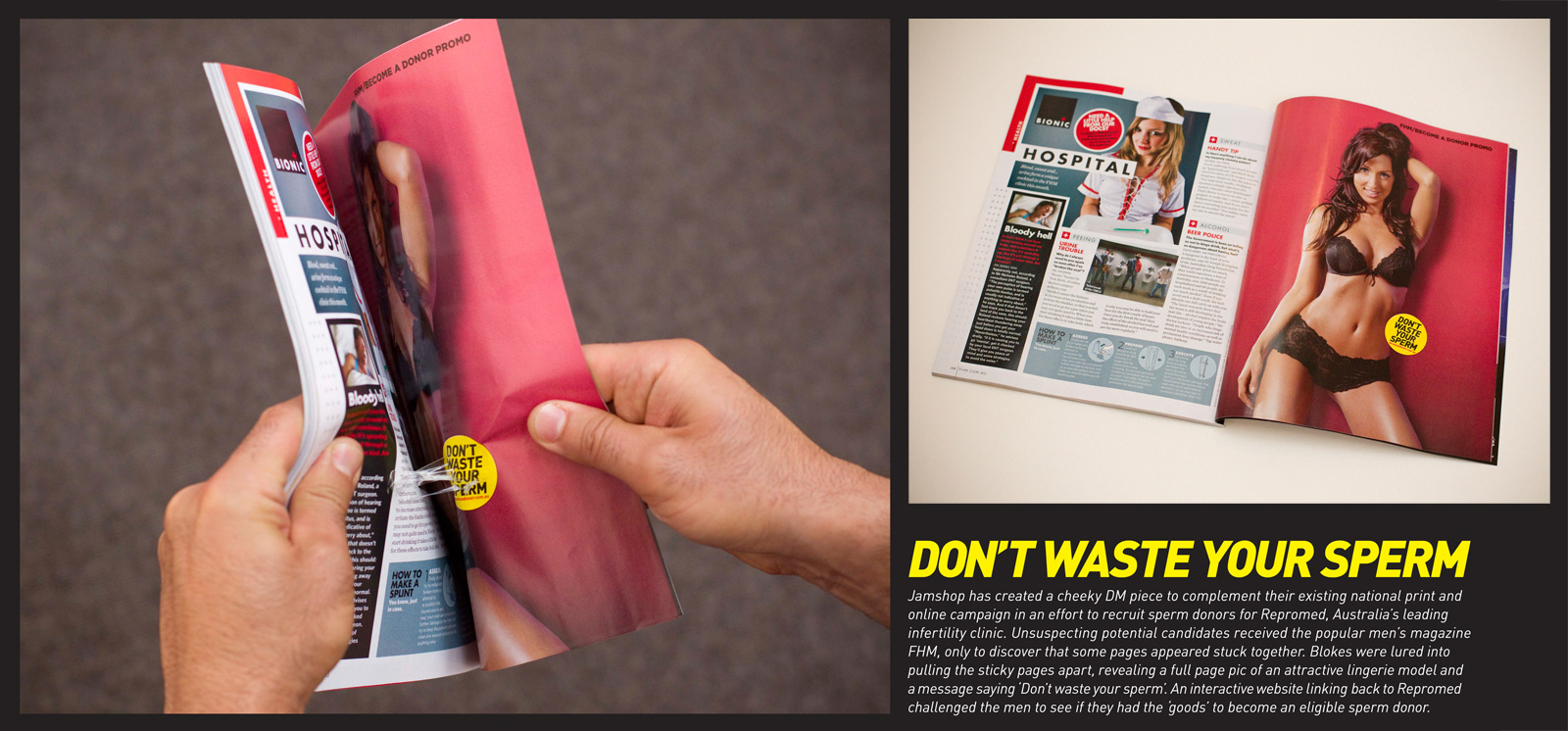Клиника Repromed призывает мужчин не расходовать семя понапраснуНеобычная печатная реклама от агентства JamshopРекламное агентство Jamshop из Австралии выпустило особую печатную рекламу для привлечения мужчин к делу борьбы с бесплодием, которой занимается ведущая в стране клиника Repromed. При содействии журнала FHMкреаторы разместили в одном из его номеров страницу с девушкой в нижнем белье, призывающая мужчин стать донорами спермы. Но суть проекта заключается не в этом, а в том, что эта страница была испачкана чем-то липким так, что слиплась с соседней. Дополнительное рекламное сообщение гласит "Не тратьте свою сперму понапрасну". Состав творческой группы |