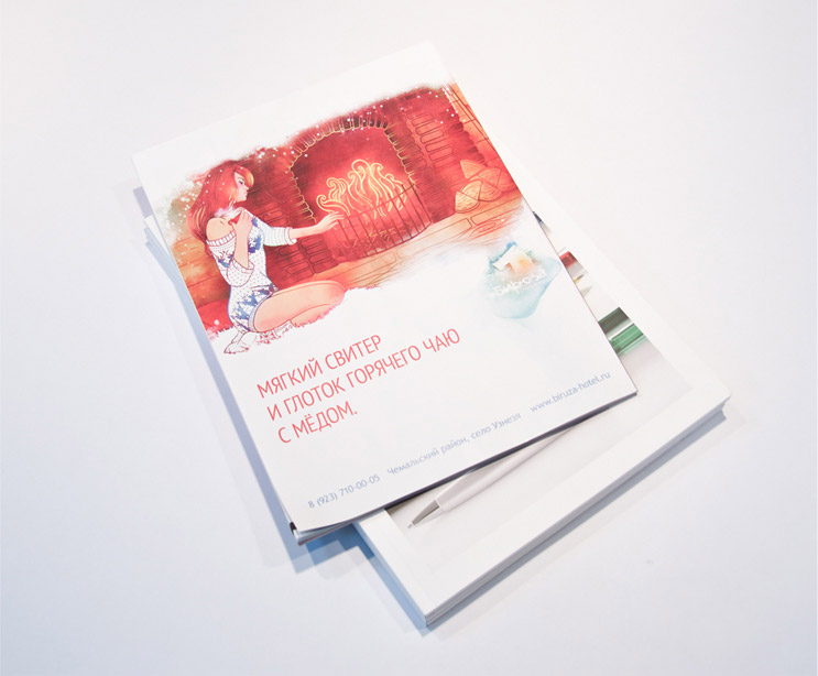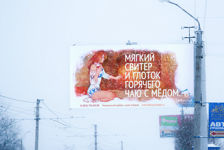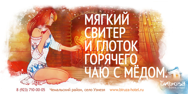 PUNK YOU иллюстрировали зимний отдыхPUNK YOU сделали зимнюю рекламу для отеля в горах "Бирюза". Ее задача - показать, что зимний отдых в отеле ничуть не хуже летнего. Летом в креативном агентстве PUNK YOU разработали наполнение бренда для новой турбазы в Горном Алтае: название, логотип и фирменный стиль.Теперь, как рассказывают в агентстве, чтобы передать всю прелесть зимнего отдыха, была нарисована теплая душевная иллюстрация: девушка в вязаном зимнем свитере тянется к камину, в котором потрескивают полешки. Рядом стоят лыжи, прислоненные к бревенчатой стене домика. Иллюстрация поддерживается посланиями: "Мягкий свитер и глоток горячего чаю с медом", "У камина тепло после лыжной прогулки", "Зимний вечер, и снег тихо так падает".