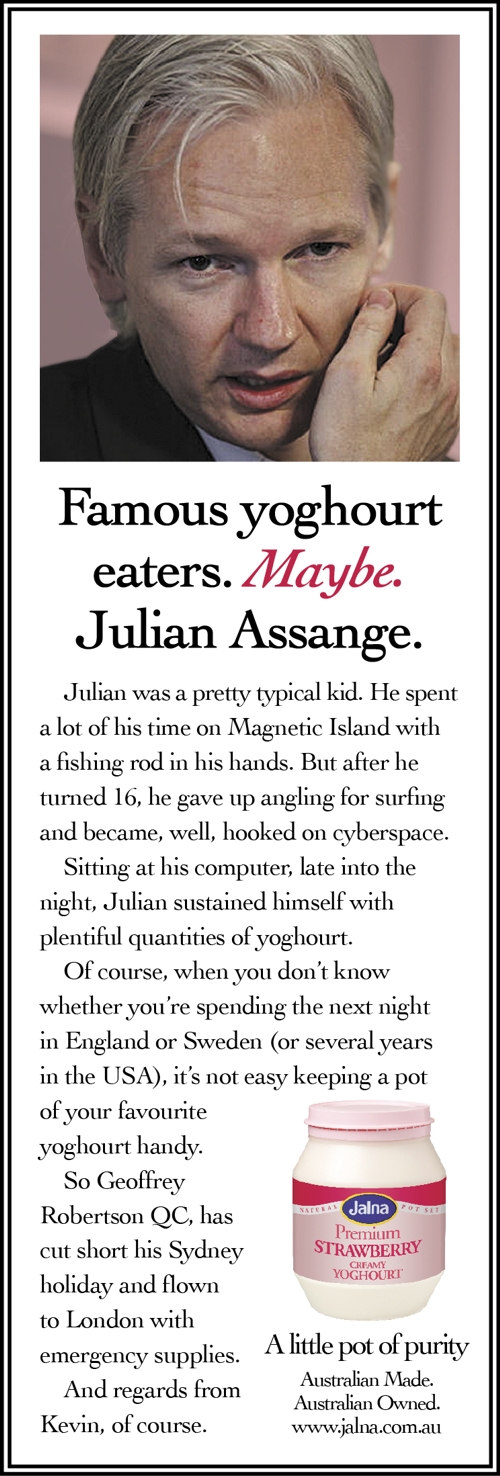 Джулиана Ассанджа использовали в рекламеИзображение "отца" WikiLeaks рекламирует йогурты JalnaАвстралийское агентство Inourtime не упустило возможности использовать скандал вору имени Джулиана Ассанджа и обращенное на него внимание прессы и общественности. Рекламисты решили использовать его образ для продвижения йогуртов компании Jalna. Но при этом принт лишь предполагает, что Ассандж мог их есть. На принте фото Ассанджа сопровождается изображением йогурта и следующим текстом: "Известные любители йогурта. Возможно. Джулиан Ассандж. Джулиан был самым обычным ребенком. Он проводил много времени на острове Магнетик с удочкой в руках. Но после того как ему исполнилось 16 он отказался от рыбалки в пользу серфинга и его, ну, зацепило киберпространство. Состав творческой группы |