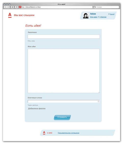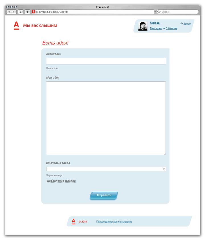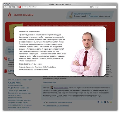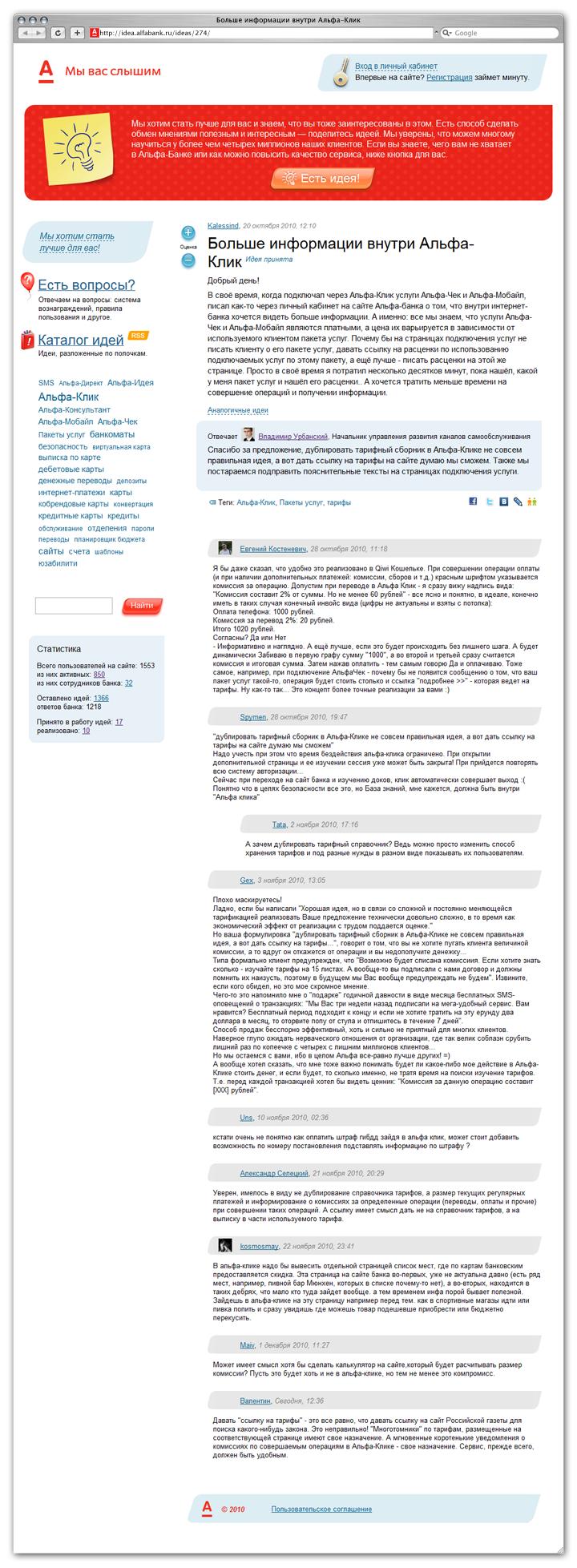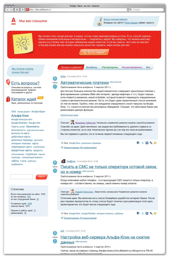 Хранилище идей от Студии ЛебедеваВ Студии Лебедева для "Альфа-Банка" создали хранилище идей - сайт idea.alfabank.ru. На сайте люди могут высказывать мысли, оставлять пожелания и делиться своими впечатлениями от работы "Альфа-Банка". Как рассказывают в Студии, в одну большую ленту собираются все поступившие идеи. Сотрудники банка изучают их и выбирают те, которые будут реализованы и сделают банк лучше. Предложения обсуждают все участники сообщества, комментарии отображаются в виде дерева. Чтобы познакомить со своими идеями еще больше народу, авторы размещают ссылки в популярных социальных сетях. Желающие поделиться мнением нажимают главную кнопку "Есть идея!" и заполняют простую форму. У каждой мысли есть заголовок - он потребуется для поиска по темам.