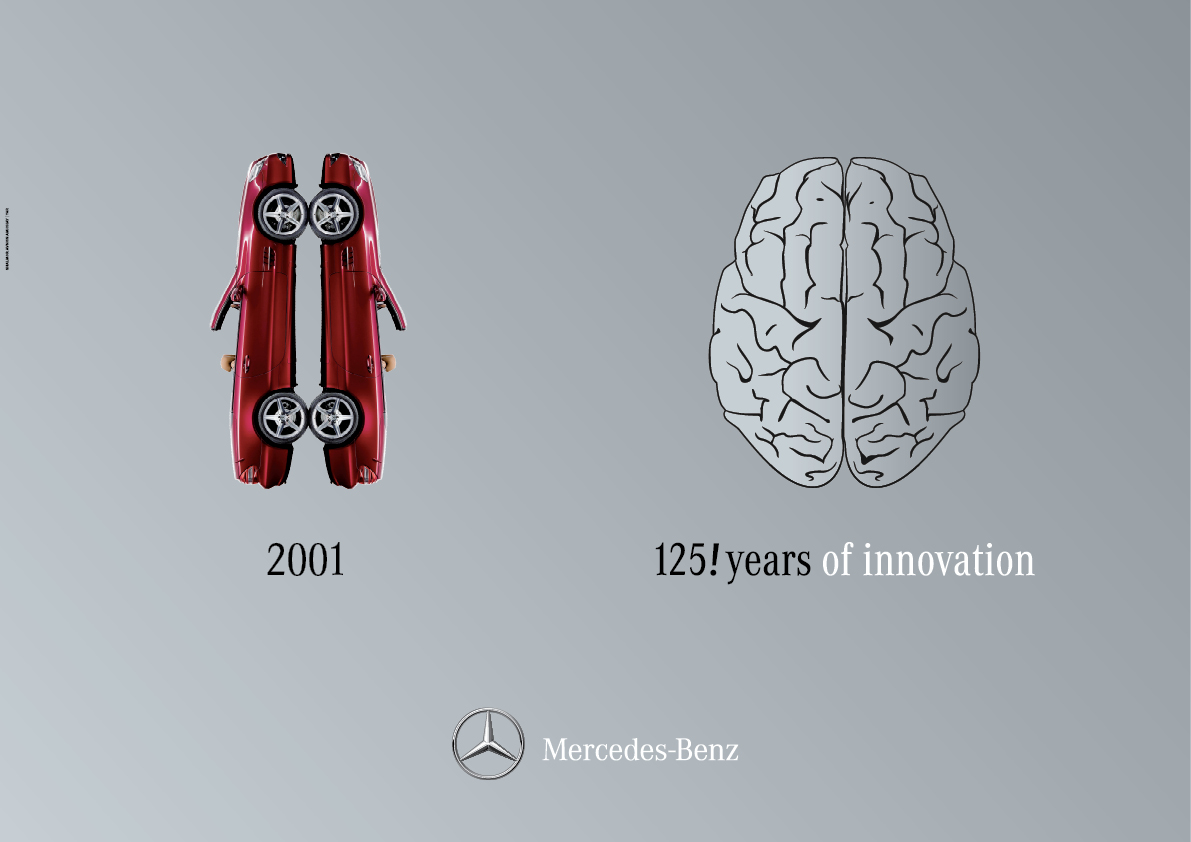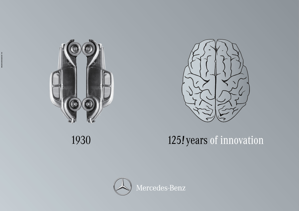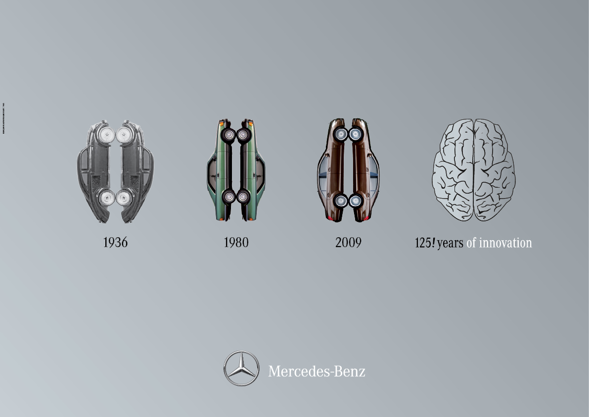 Mercedes-Benz сравнивает свои авто с мозгомКампания в честь 125-летия автоконцернаИзраильское агентство Shalmor Avnon Amichay/Y&R Interactive TelAviv выпустило серию принтов, приуроченных к 125-летию автоконцерна Mercedes Benz. Кампания проходит под слоганом "125 лет инноваций", поэтому креаторы решили показать прямую связь инновационного мышления разработчиков автомобилей компании и конечным продуктом. На принтах они сравнили автомобили Mercedes Benz различных годов выпуска непосредственно с человеческим мозгом. Состав творческой группыAdvertising Agency: Shalmor Avnon Amichay/Y&R Interactive Tel Aviv, Israel Chief Creative Officer: Gideon Amichay Executive Branding Director: ZeevRavid Creative: AdiSova Copywriter: Gil Katzir Executive Client Director: Tal Fishbain Account Supervisor: Yael Yuz Account Executive: MayranSadeh Planning Director: Yoni Lahav Planners: MatanLerman, NiliRabinowitz |