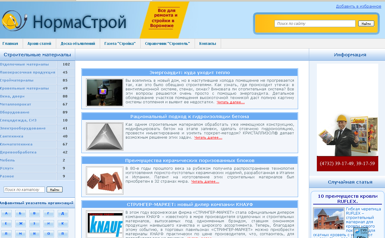 Редизайн сайта для воронежских строителейНачал работу обновленный сайт строительного каталога "Норма-Строй", одного из специализированных интернет-изданий в Центрально-Черноземном регионе. Как говорят создатели сайта, основная цель его работы, предоставление актуальной и полной информации профессионалам и частным лицам о новинках и тенденциях строительного рынка. Сайт содержит спектр материалов, посвященных строительству, проектированию, ремонту и дизайну. Более 10 разделов предоставляют информацию о строительных, отделочных, кровельных материалах, спецтехнике и различному оборудованию, одежде и услугах. Над сайтом работали в агентстве "Тэга". |