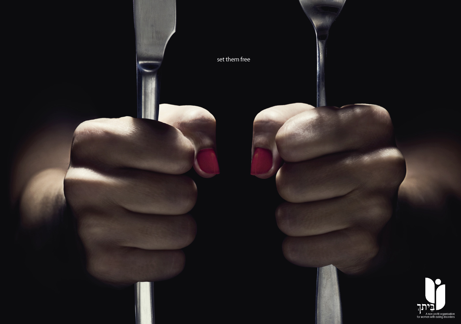 Расстройства приема пище как тюрьмаПродолжение кампании организации BeitechНекоммерческая организация Beitech и агентство MccannEricksonTelAviv ранее выпускали печатную рекламу, которая была направлена на то, чтобы женщины, страдающие анорексией, обращались за помощью к специалистам. Сейчас организация выпустила новый принт, посвященный нарушениям приема пищи. Реклама сравнивает эти заболевания с тюрьмой, тогда как сама организация Beitech предстает, как средство освобождения.