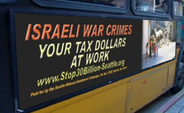 Наряду с обращением "Военные преступления Израиля - вот на что тратят деньги налогоплательщиков" на фотопринтах изображены палестинские дети, которые смотрят на руины здания, разрушенного во время трехнедельной наземно-воздушной атаки Газа Израилем в декабре 2008 года и январе 2009 года. Ниже приведена ссылка "www.Stop30Billion-Seattle.org". "Stop30Billion-Seattle" относится к военной поддержке Израиля Соединенными Штатами в размере 30 миллиардов долларов. Стоимость "проката" кампании составила $2760 за 1 месяц.