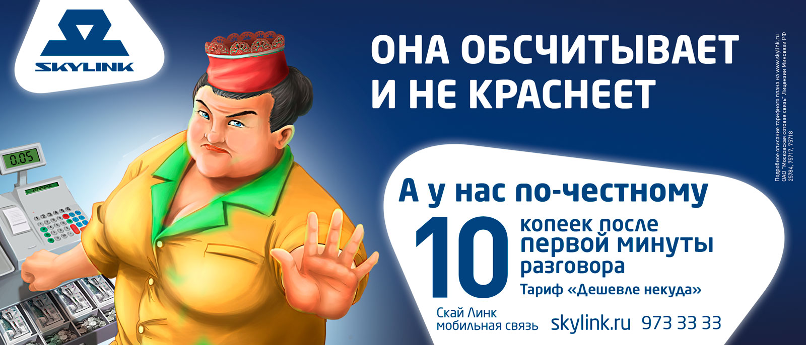 В кампании "Скай Линка" усмотрели намек на конкурентовКампания оператора мобильной связи "Скай Линк" в поддержку тарифа "Дешевле некуда", размещающаяся в московском метро, обыграла фирменные цвета конкурентов. В одежде изображенной на макете продавщице фигурируют красный цвет МТС, зеленый "Мегафона" и желтый "Билайна". Кампания разработана агентством MILK. Текст макета: "Она обсчитывает и не краснеет. А у нас все по-честному". Намеренным или нет стал намек на конкурентов в рекламной кампании, сказать сложно. В самой компании "Скай Линк" комментировать ее не стали. Но по мнению креативного директора агентства Young&Rubicam Татьяны Тютюнник, еcли цвета на костюме продавщицы и намекают на брендцвета МТС, Билайна и Мегафона, то настолько тонко, что на это сложно обратить внимание. Так что эта аллюзия, по ее словам, иллюзорна и неочевидна.